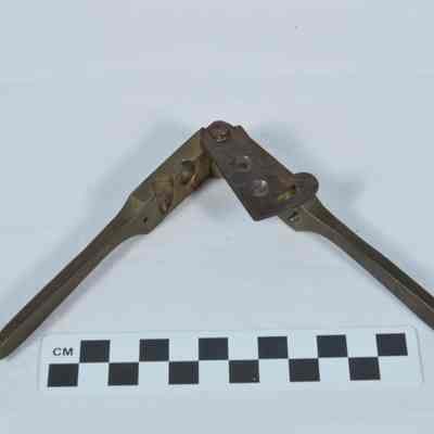 Brass bullet mold with two cavities (one conical and one round) for making .375 caliber bullets. Two hinged, brass arms press the sides of the mold together. Iron spruce cutter is hinged to one side of the mold cavities.Acquisition