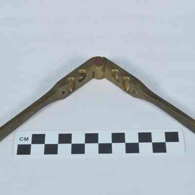 Brass bullet mold with two cavities (one conical and one round) for making .31 caliber bullets. Two hinged, brass arms press the sides of the mold together.Acquisition