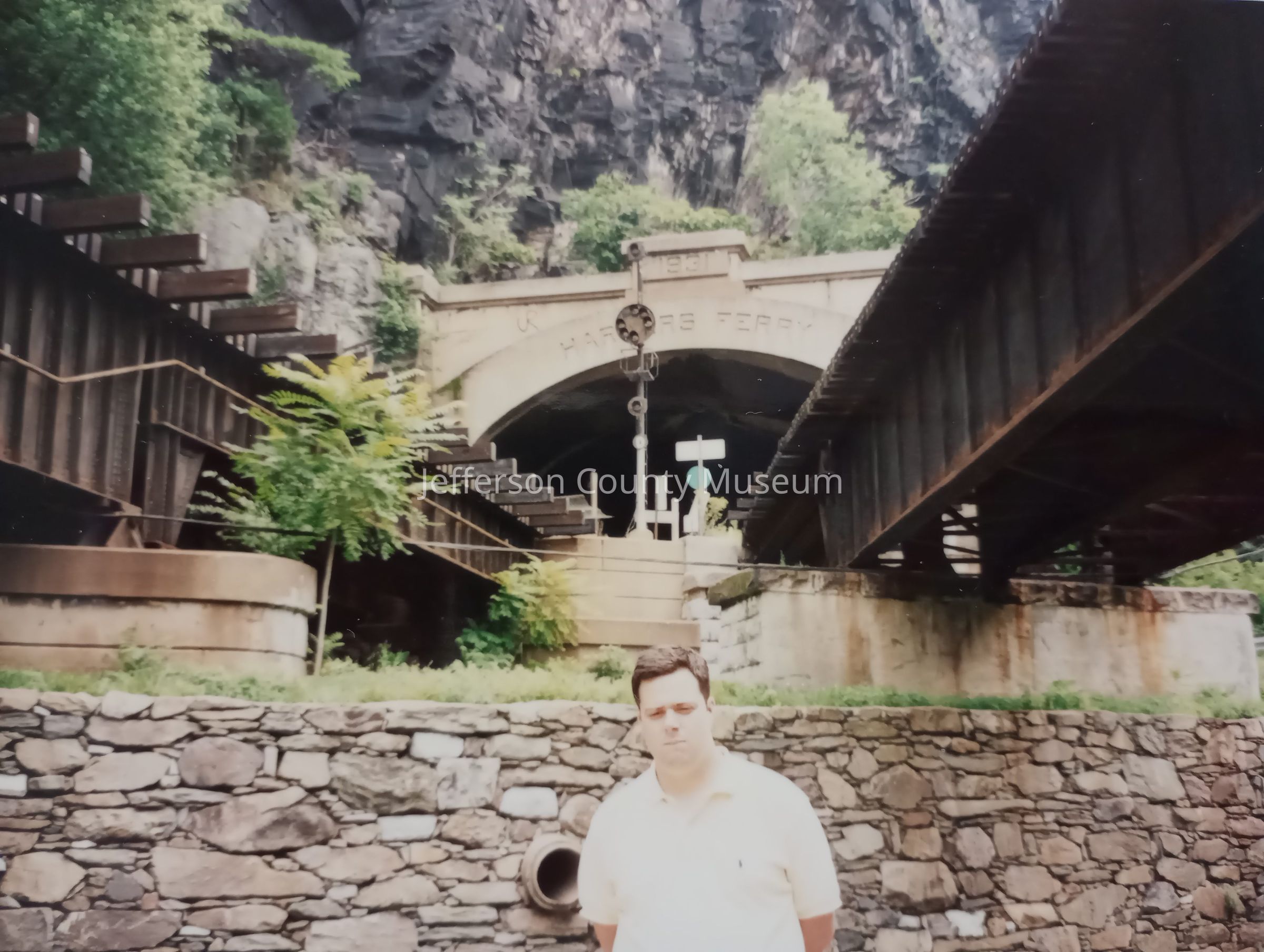 Color photo of the donor standing beneath the Harpers Ferry tunnel at the base of Maryland Heights.Photograph Details