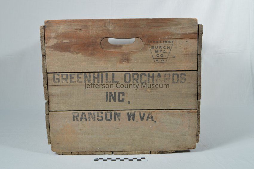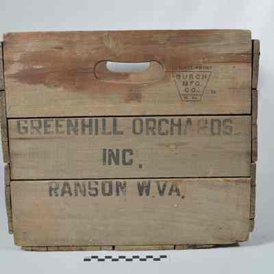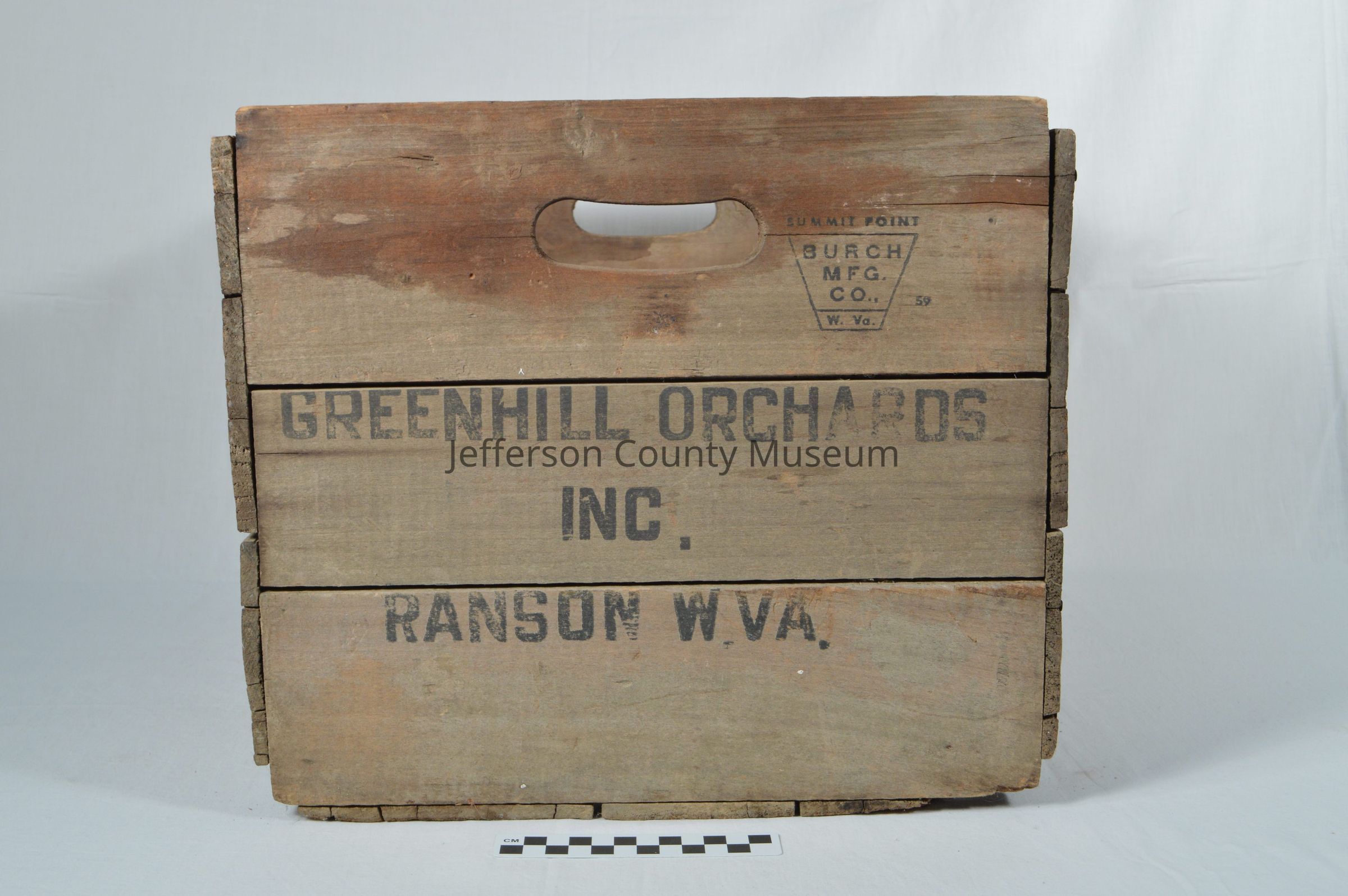 Wooden apple box from Greenhill Orchards in Ranson, West Virginia. Stamped on two ends with: GREENHILL ORCHARDS INC. RANSON W. VA. Stamped in upper corner of each end: SUMMIT POINT and below that in a trapezoid: BURCH MFG. CO., W. Va. To the right of the trapezoid: " 59 ".Acquisition