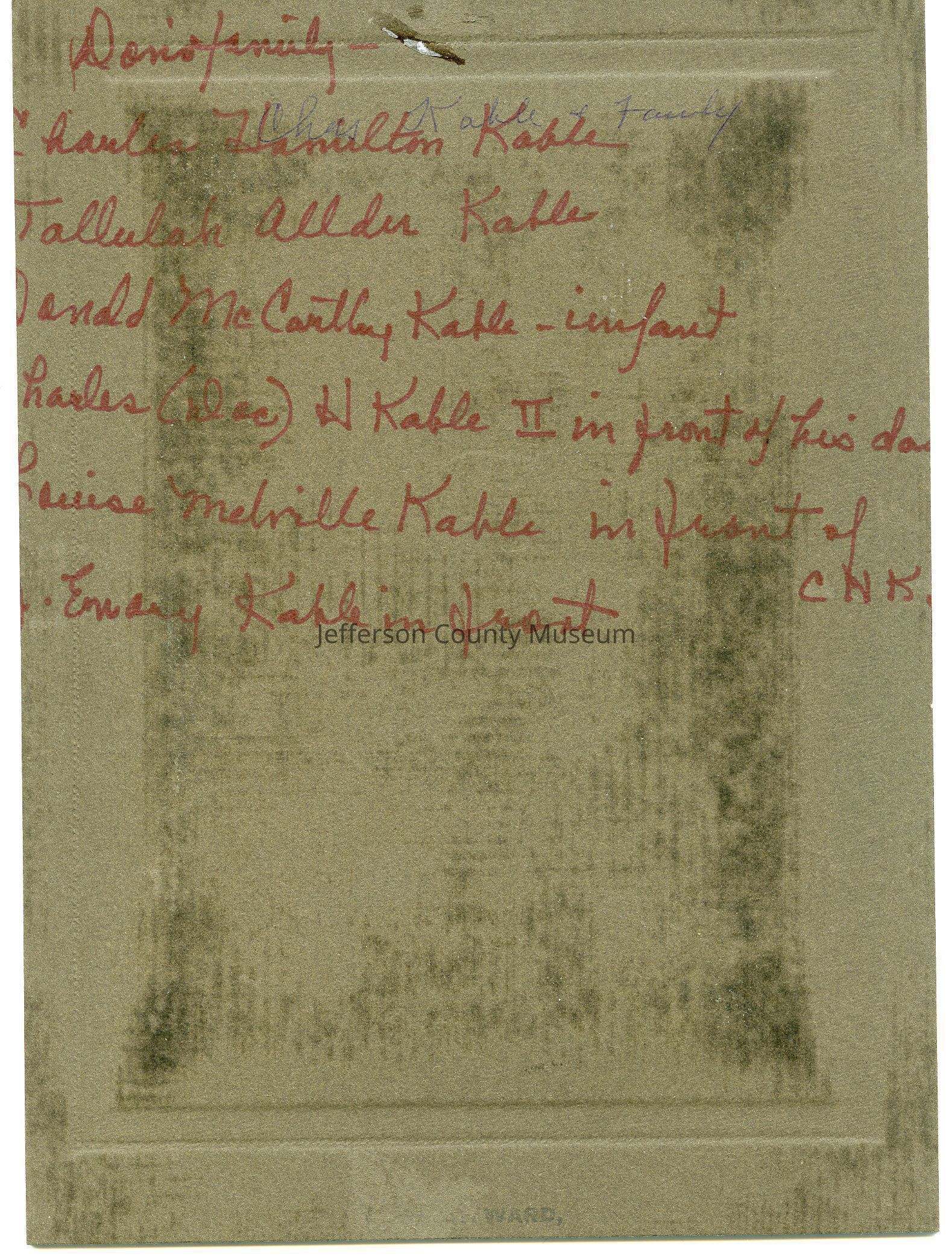 Don's family - Charles Hamilton Kable, Tallulah Allder (Alder) Kable, Donald McCarthy Kable (infant), Charles "Doc" H. Kable II in front of his dad, Louise Melville Kable in front of CNK, Emory Kable in front.