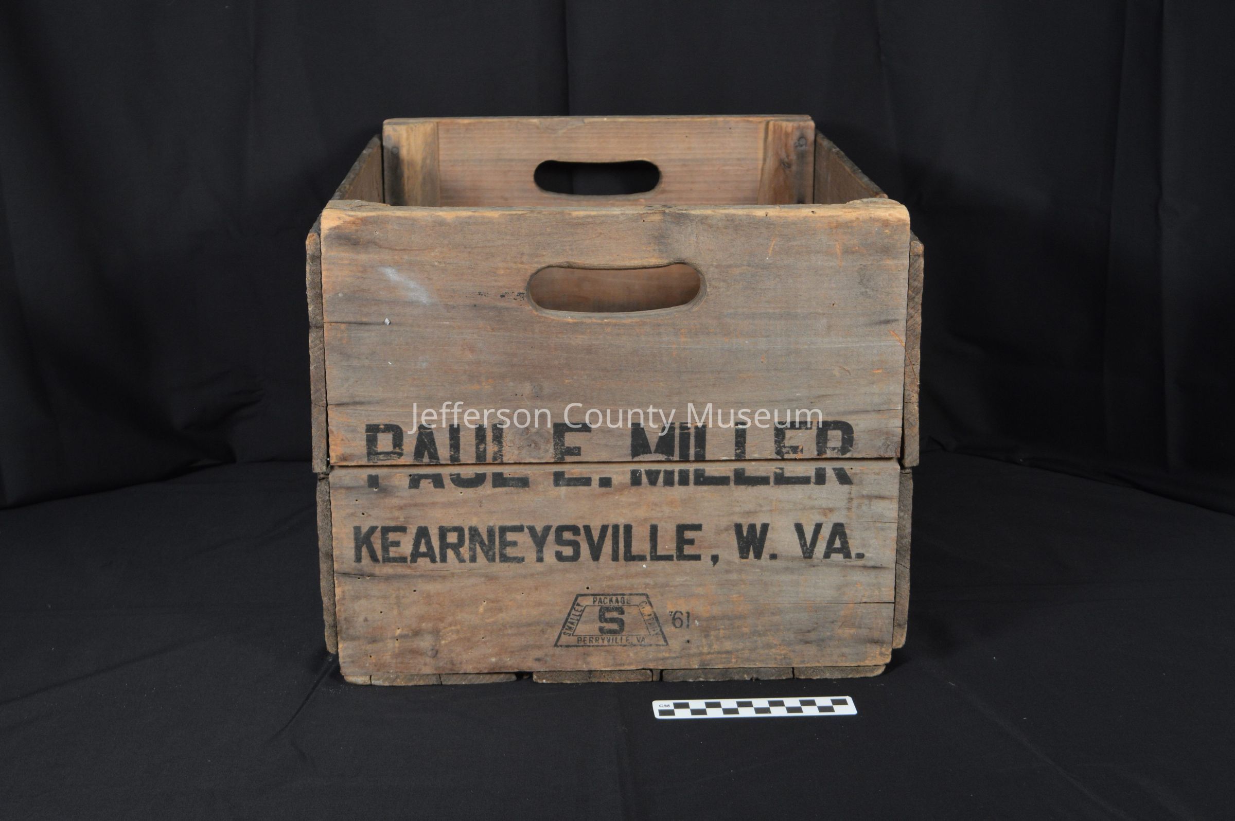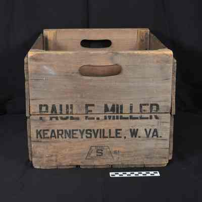 Wooden apple box from Paul E. Miller orchard in Kearneysville, West Virginia. Stamped on two ends with: PAUL E. MILLER KEARNEYSVILLE, W. VA. Below that in a trapezoid: SMALLEY PACKAGE COMPANY BERRYVILLE, VA. surrounding a large " S ". To the right of the trapezoid: " '61 ".Acquisition