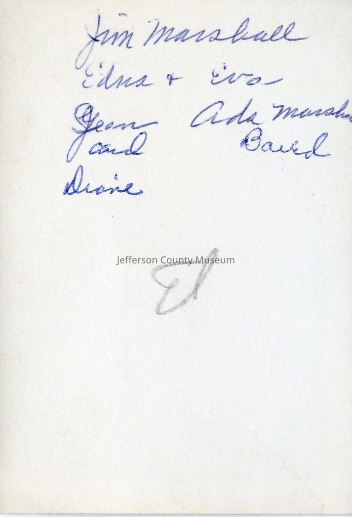 (Front row, left to right) Diane O'Bannon, Jean Marshall O'Bannon (daughter to Edna and J. R. Marshall), James Riddle Marshall (Gary Kable's grandfather), Aunt Ada Marshall Baird
