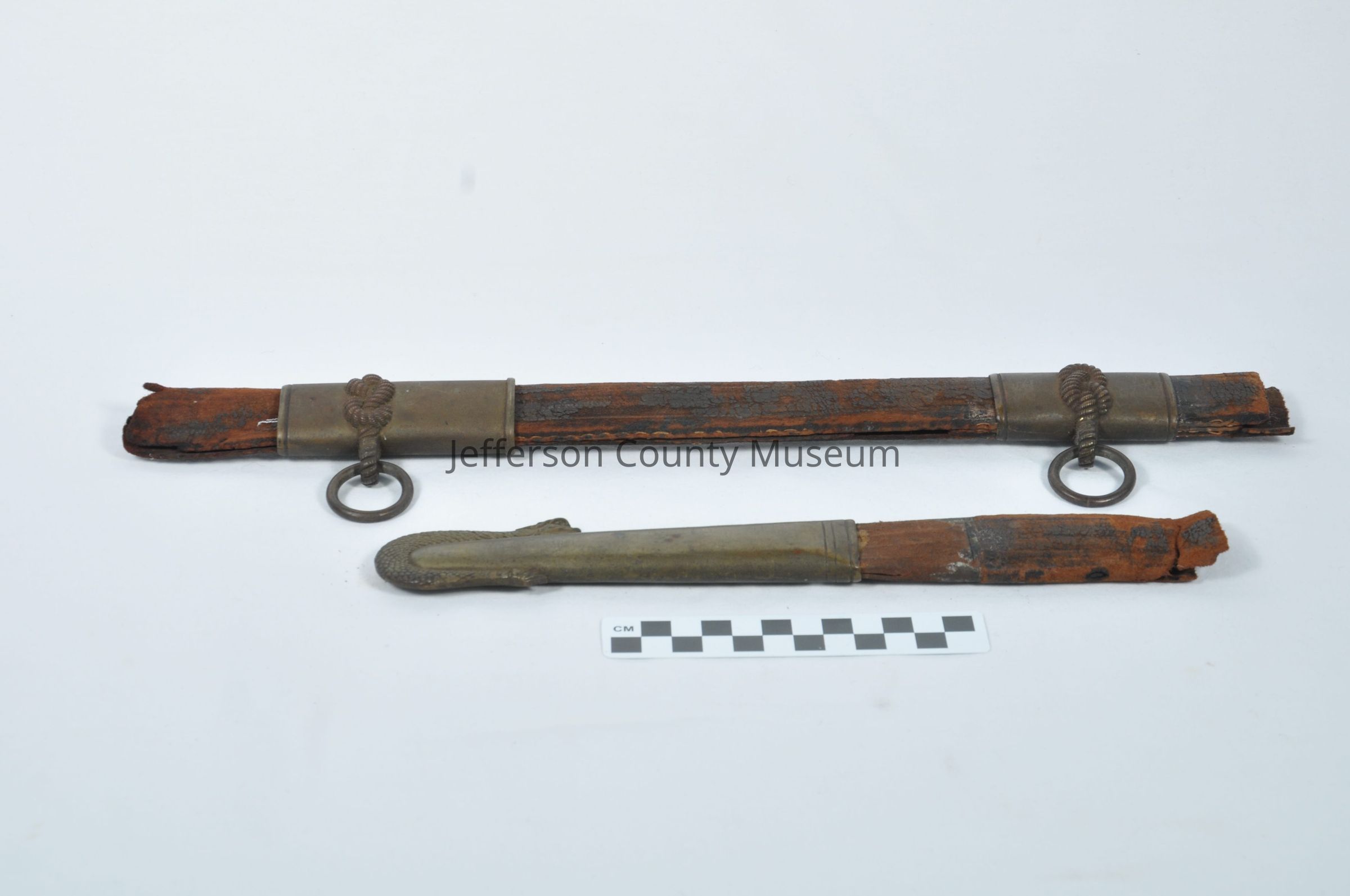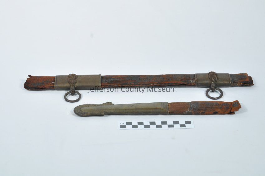 U.S. Navy scabbard used with dress sword cataloged as #2101. Brown leather scabbard with 3 brass sections attached: one at the very tip with a serpent engraved, and two farther up the length of the scabbard with rope designs engraved and two hoops attached, presumably for attaching to a strap or belt. Scabbard is broken into two pieces (a & b).Acquisition