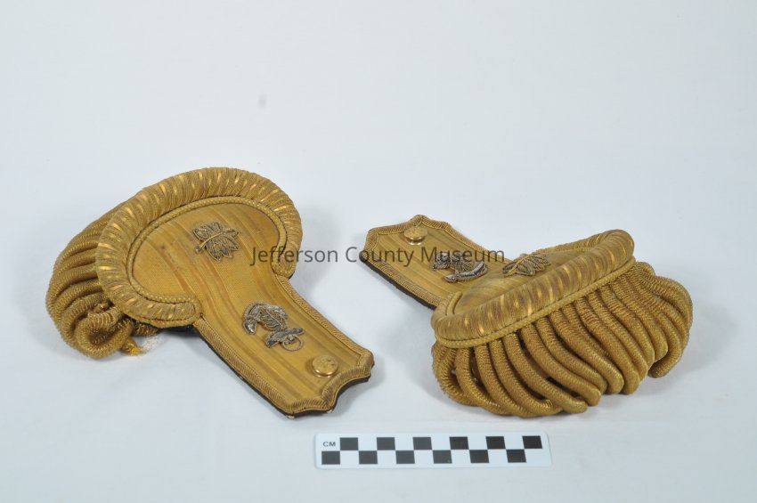 U.S. Navy epaulets. Top of epaulets are textured, gold fabric, with rope-like gold edges. Gold wire fringe hangs down around the rounded edges. The tops of the shoulder-boards each have an oak leaf symbol and an anchor, rope, and leaf symbol attached, as well as a small round button with an eagle. The underside of the shoulder-boards are brass and leather, with a small embossed "Left" (a) and "Right" (b) next to a small clip for attaching to a uniform. The underside of the rounded shoulder is padded velvet.Acquisition