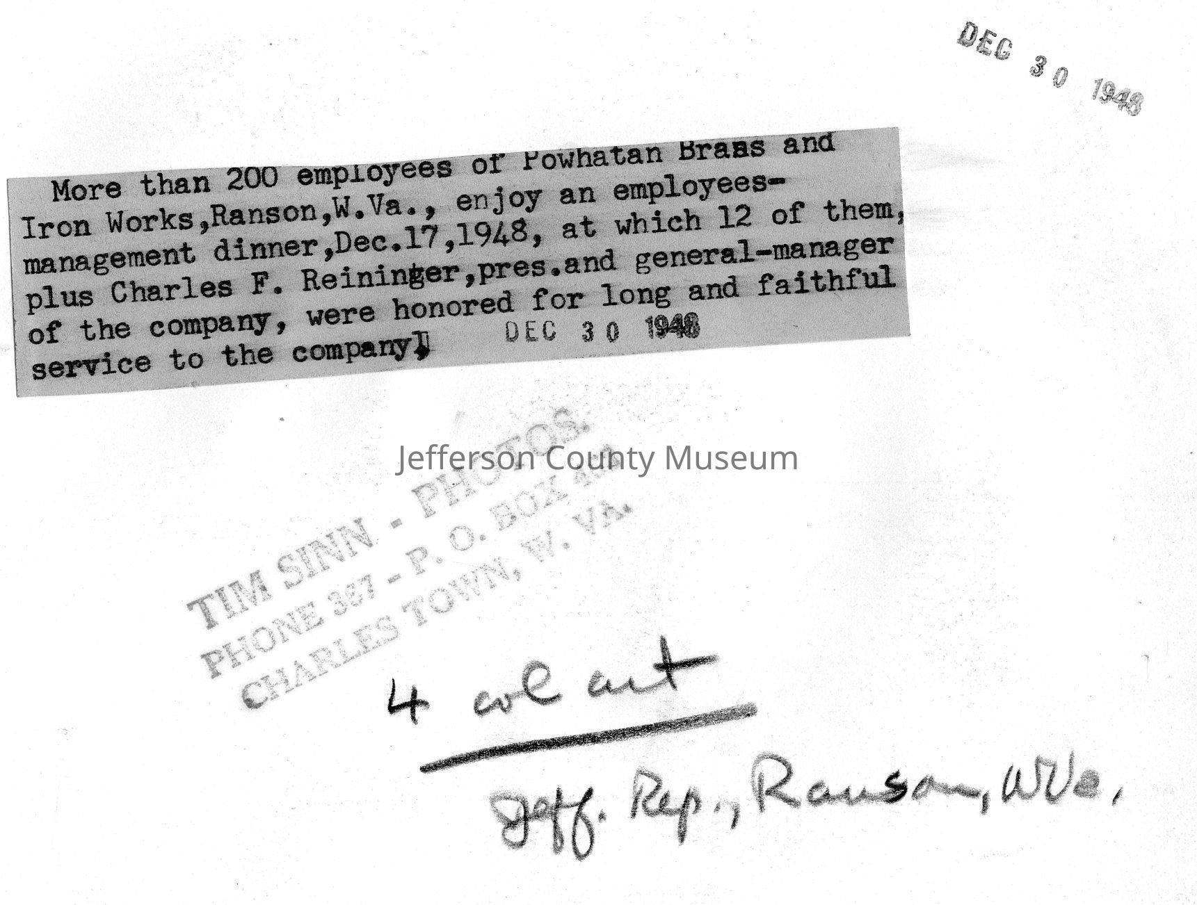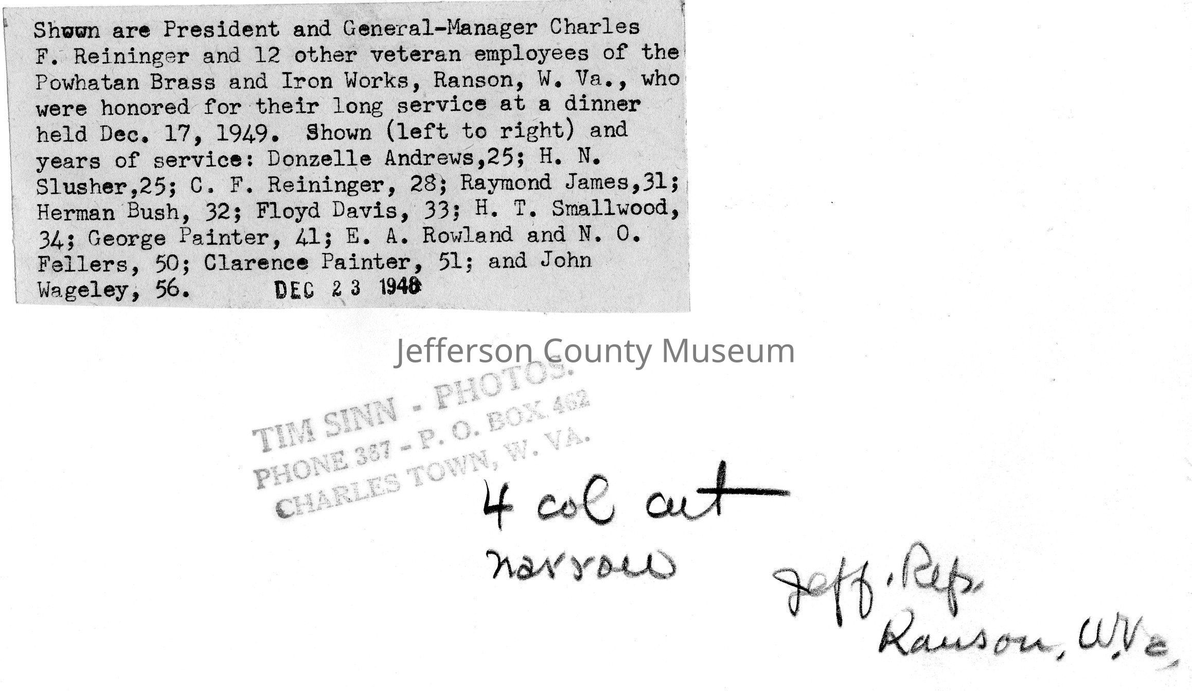 IMG3555-3: "Shown are President and General-Manager Charles F. Reininger and 12 other veteran employees of the Powhatan Brass and Iron Works, Ranson, W. Va., who were honored for their long service at a dinner held Dec. 17, 1949. Shown (left to right) and years of service: Donzelle Andrews, 25; H. N. Slusher, 25; C. F. Reininger, 28; Raymond James, 31; Herman Bush, 32; Floyd Davis, 33; H. T. Smallwood, 34; George Painter, 41; E. A. Rowland and N. O. Fellers, 50; Clarence Painter, 51; and John Wageley, 56." Stamped Dec 23, 1948, Tim Sinn - Photos, Phone 367, P.O. Box 462, Charles Town, W. VA., written in pencil "Jeff. Rep. Ranson, W. Va."