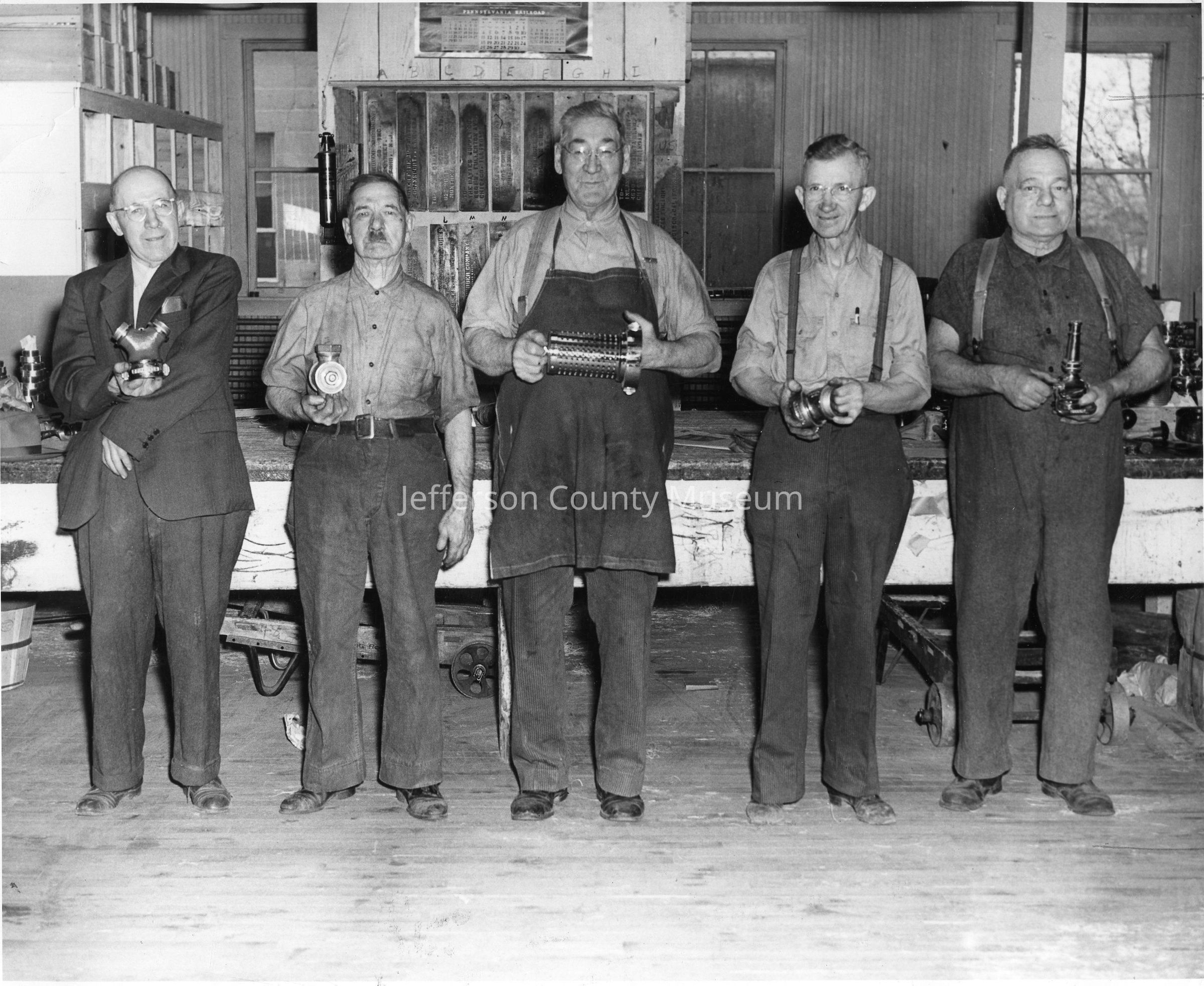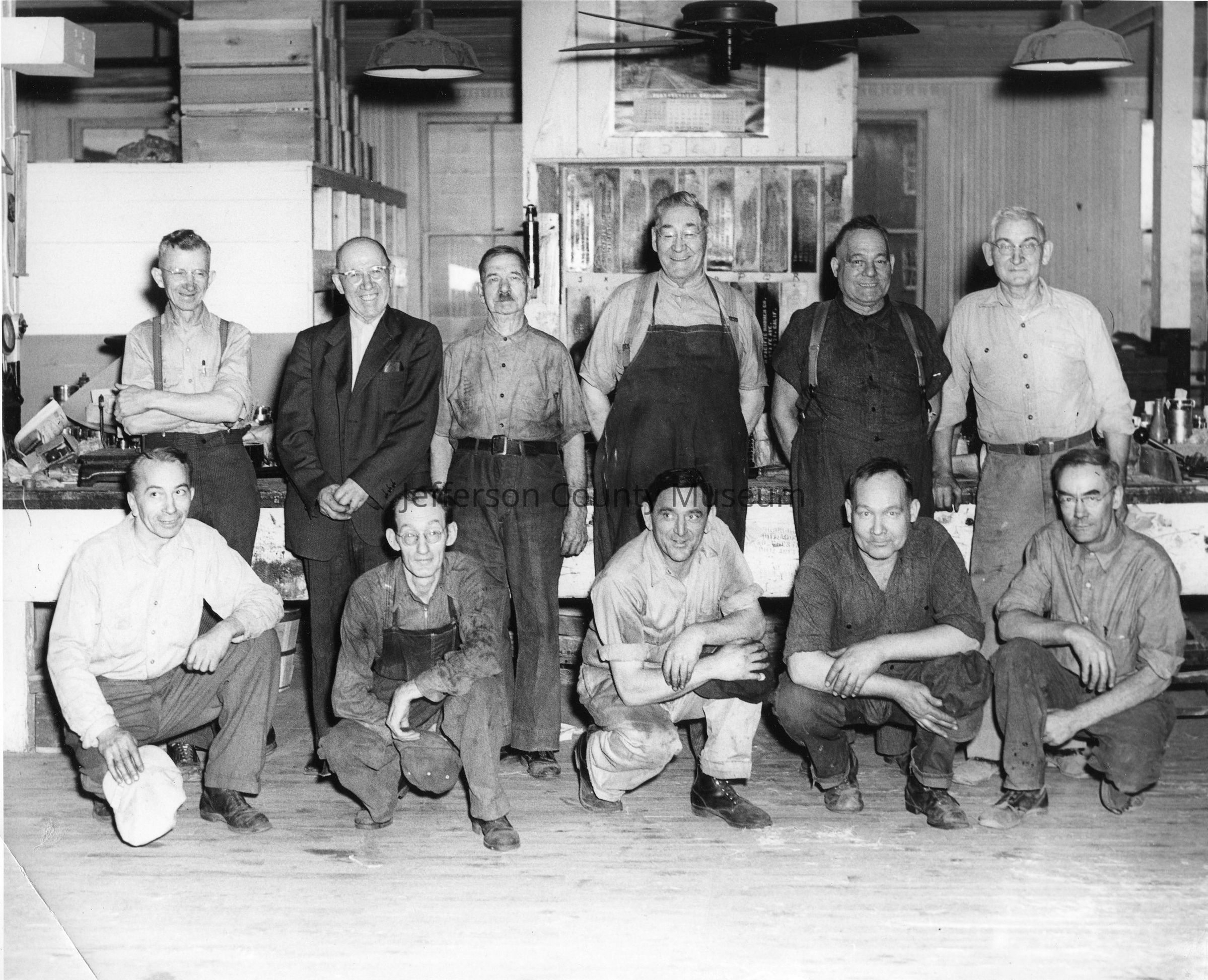 IMG3555-1: Employees at Powhatan Brass and Iron Works - second row second from left Raymond James, back reads "The Jefferson Republican," stamped November 11, 1949, Fitzpatrick Studios, Charlestown, W. VA.