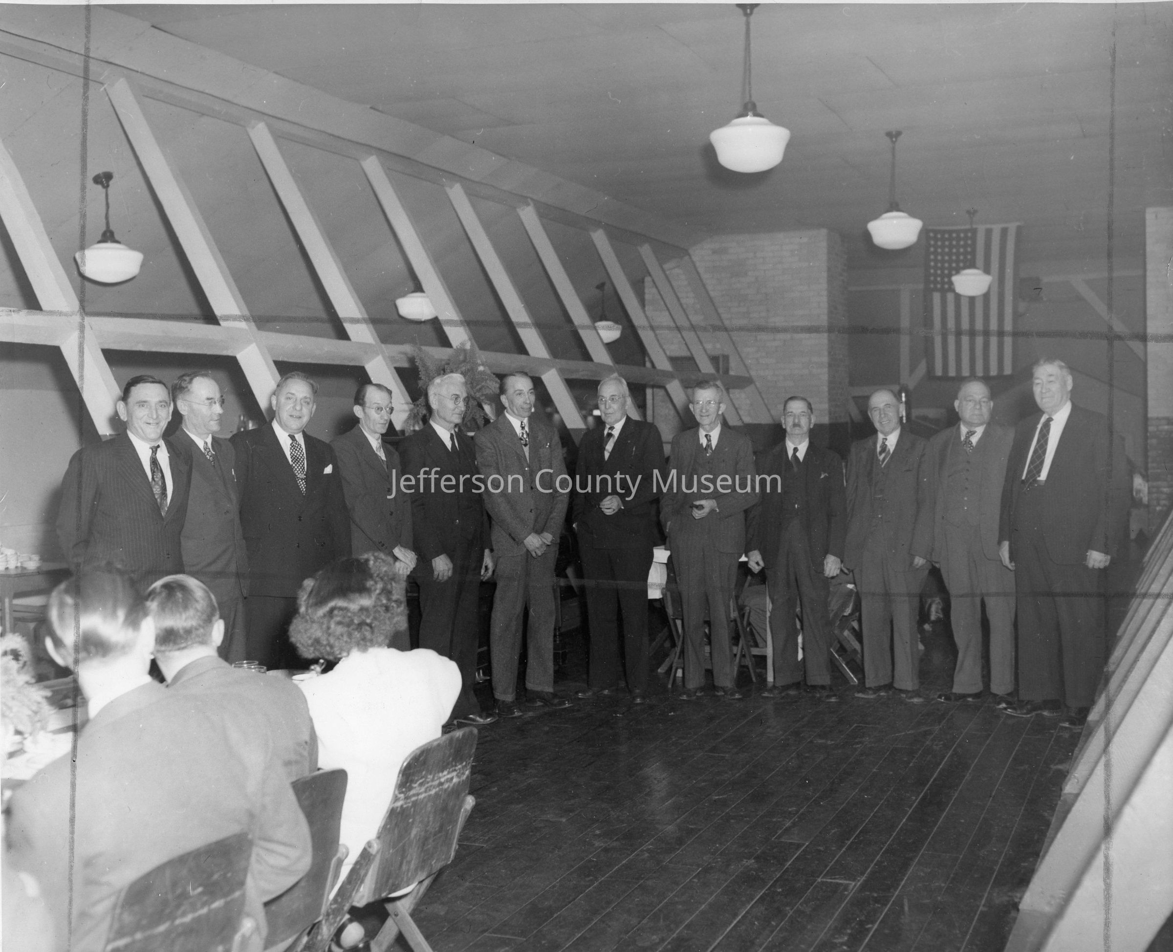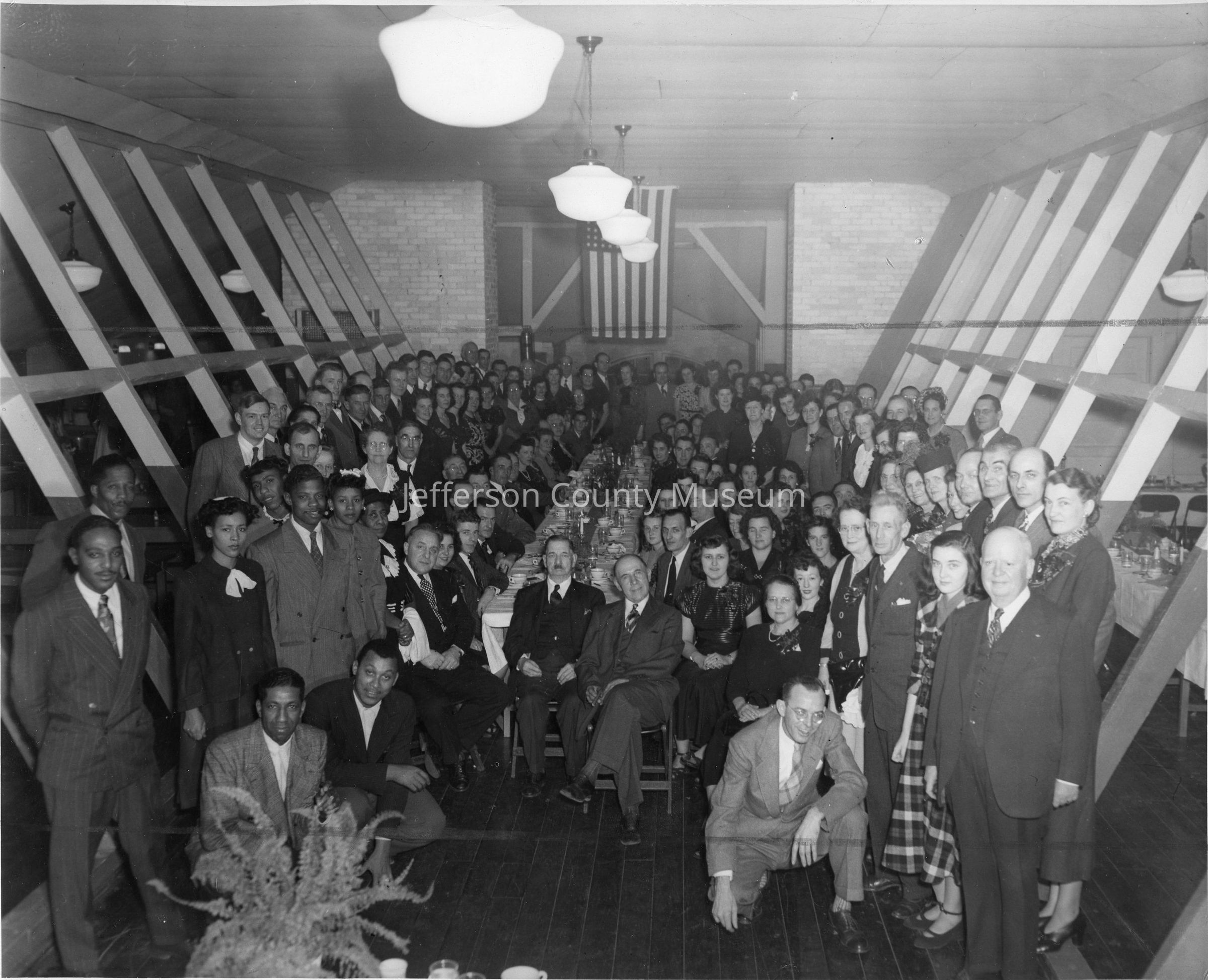 IMG3555-2: More than 200 employees of Powhatan Brass and Iron Works, Ranson, W. Va., enjoy an employees-management dinner, Dec. 17, 1948, at which 12 of them, plus Charles F. Reininger, pres. and general-manager of the company, were honored for long and faithful service to the company." Back is stamped Dec 30, 1948 and Tim Sinn-Photos, phone 367, P.O.Box 462, Charles town, W. VA.". Written in pencil "Jeff. Rep., Ranson, WVa."
