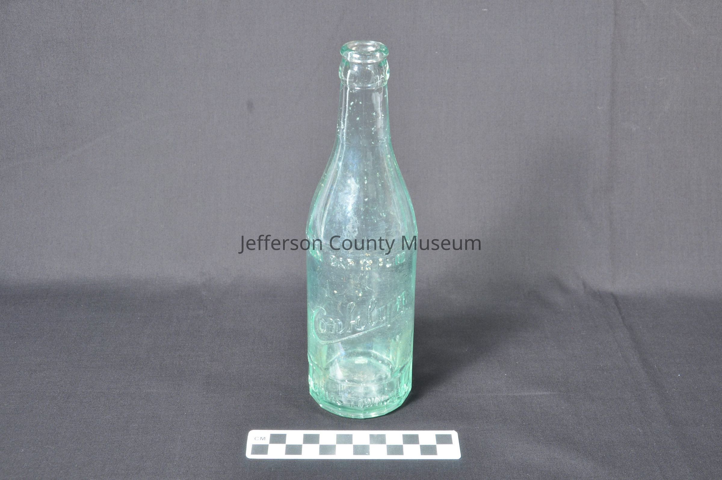 Green glass beverage bottle. Embossed around bottle "MIN. CAP. 12 FL. OZ. Conklyn CHARLES TOWN, W.VA.". On edge at bottom of bottle: "2570E" and "G25"Acquisition