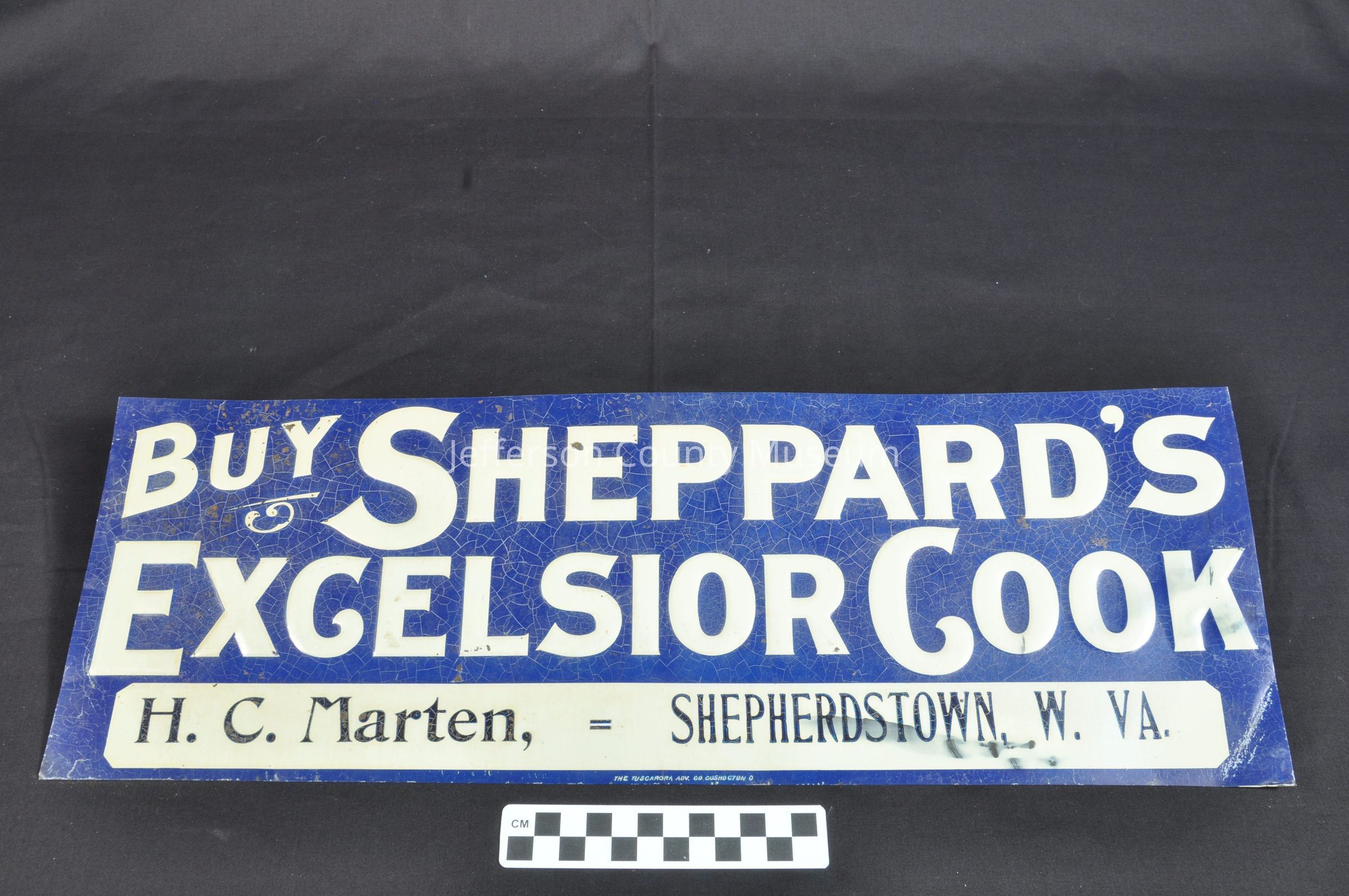 Porcelain sign advertising a Shepherdstown business, Sheppard's Excelsior Cook at H.C. Marten. Shepherdstown, W.Va.