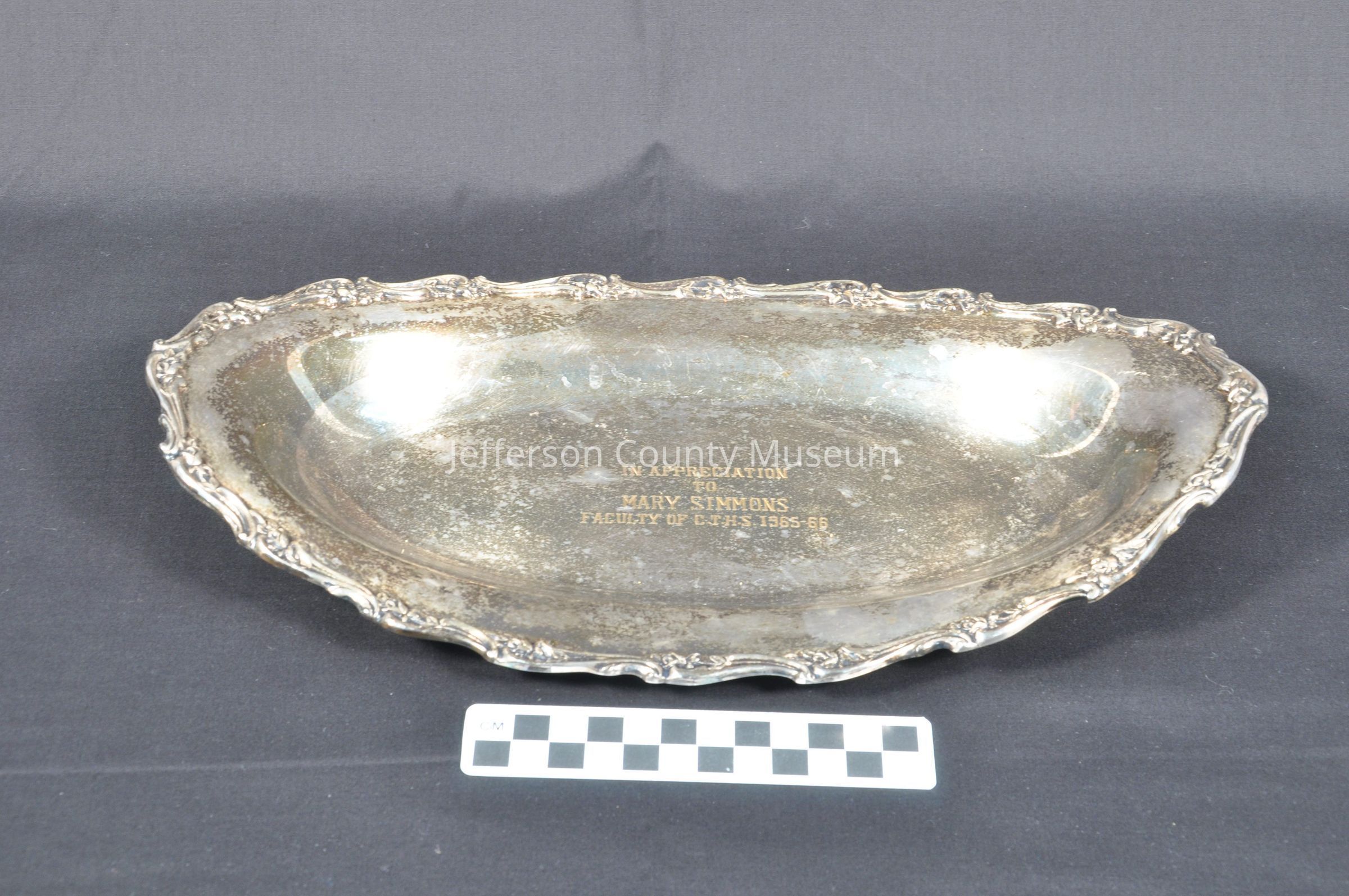 Commemorative silver tray presented by the faculty of Charles Town High School to Mary Milton Simmons upon her retirement from teaching at the school in 1966.