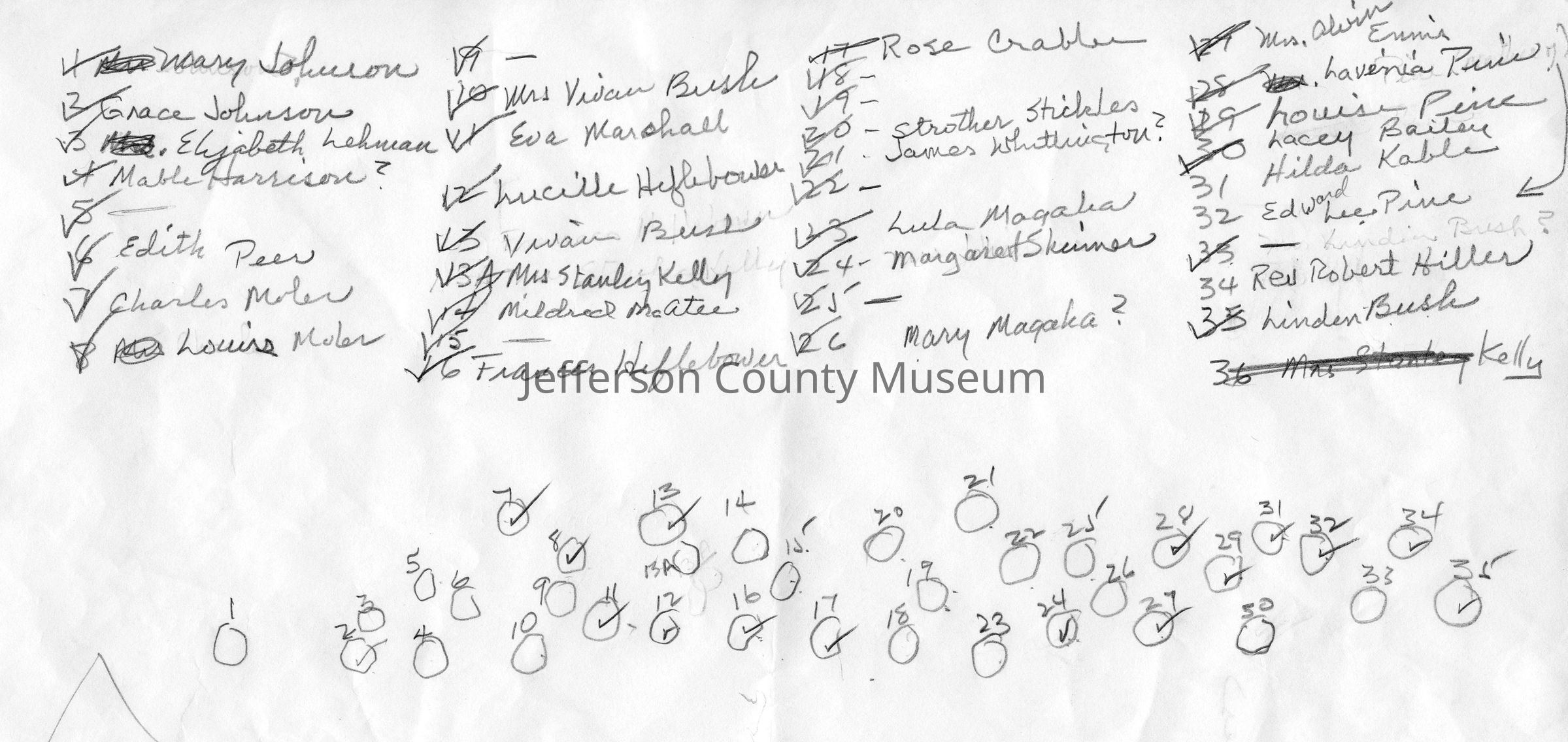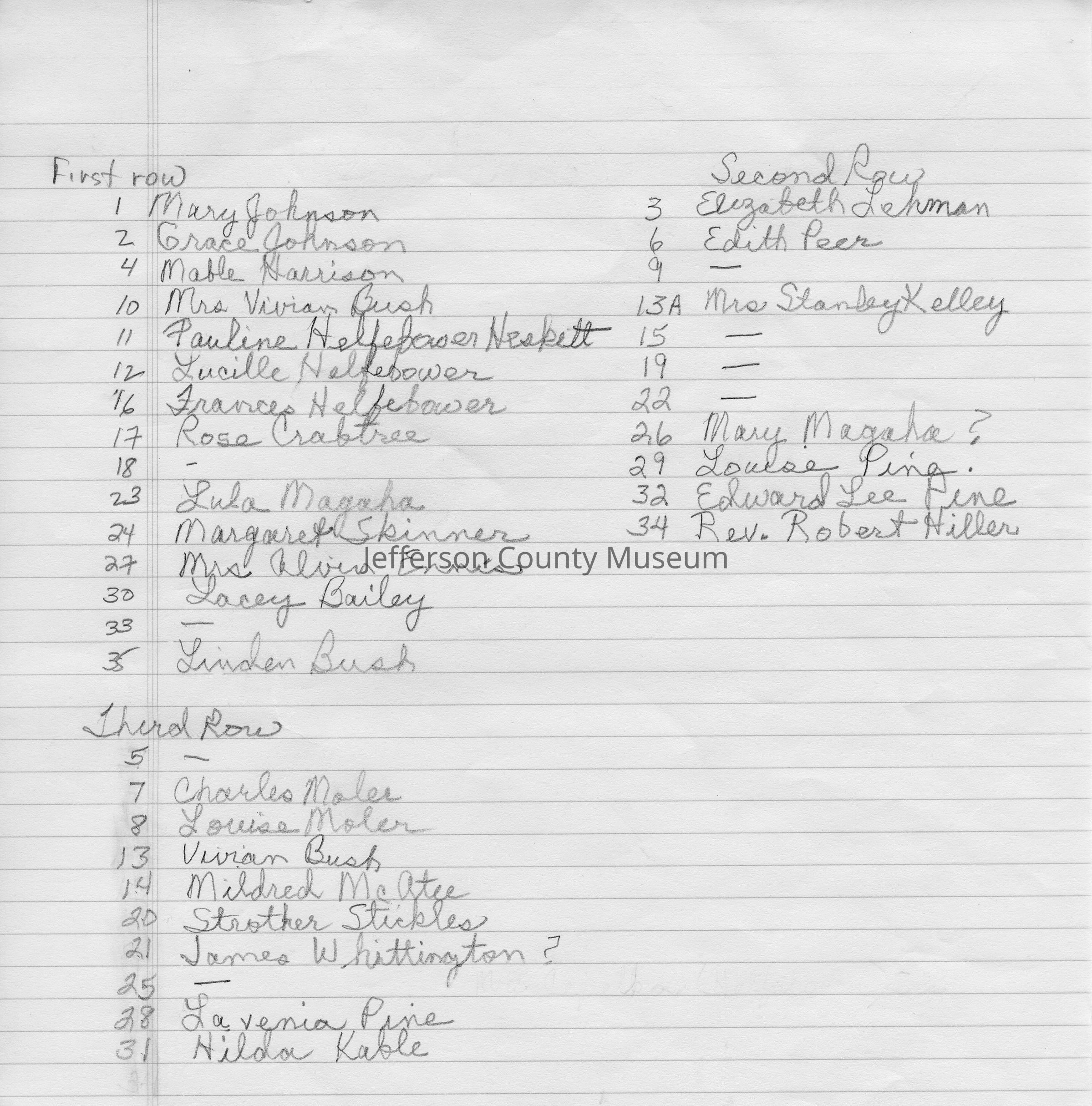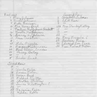 Second row: Elizabeth Lehman, Edith Peer, Mrs. Stanley Kelley, Mary Magaha?, Louise Ping, Edward Lee Pine, Rev. Robert Hiller