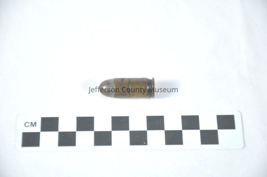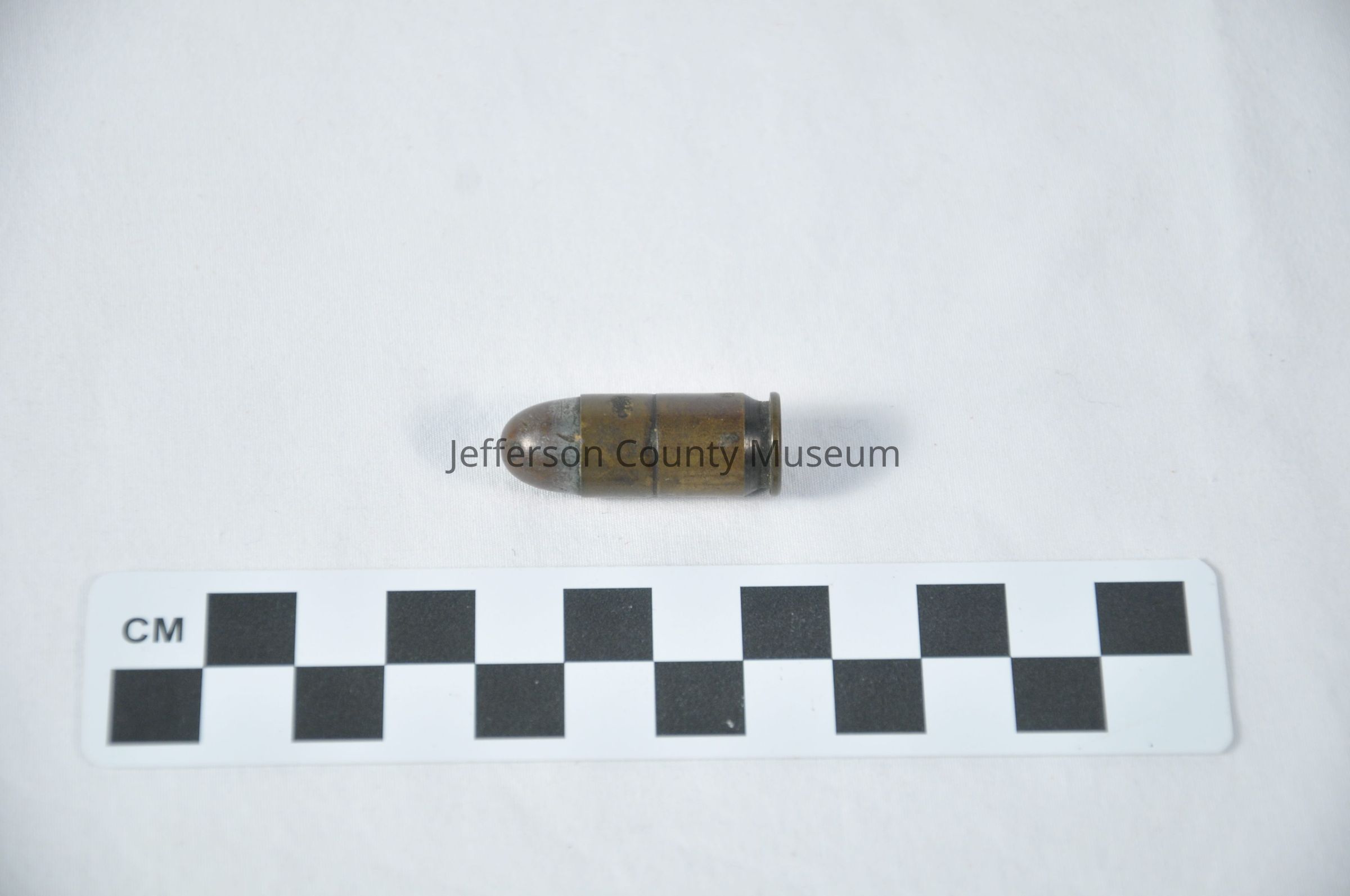 One 7.65 X 20 mm Longue rimless cartridge. Designed too late for use in World War I; designed by but abandoned by United States; used in France and Germany during World War II. On bottom of casing: F A 17Acquisition