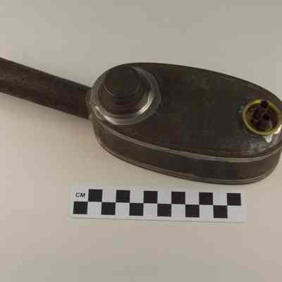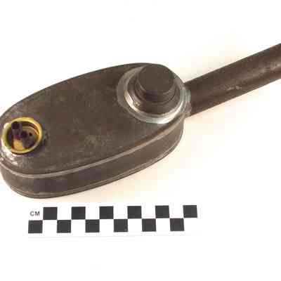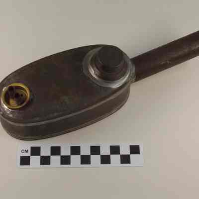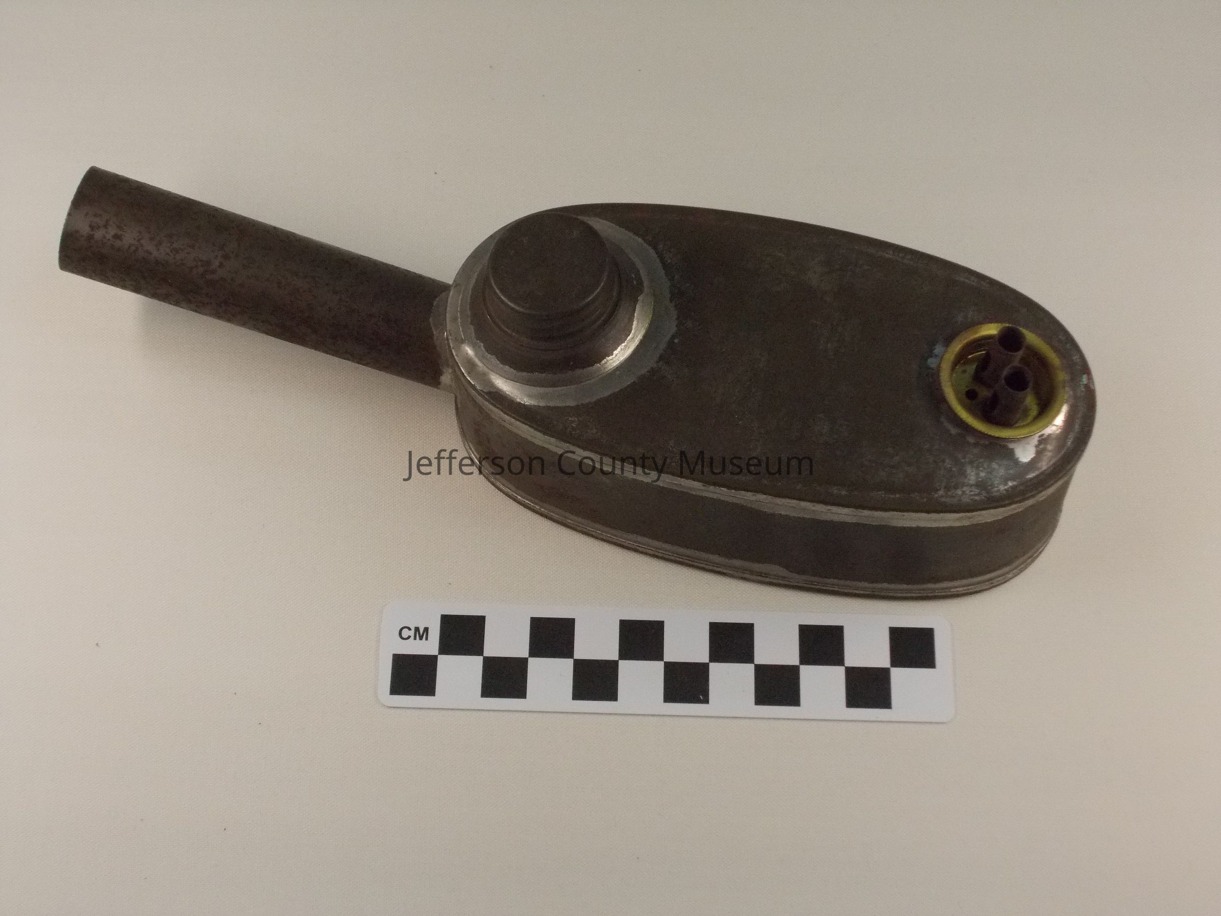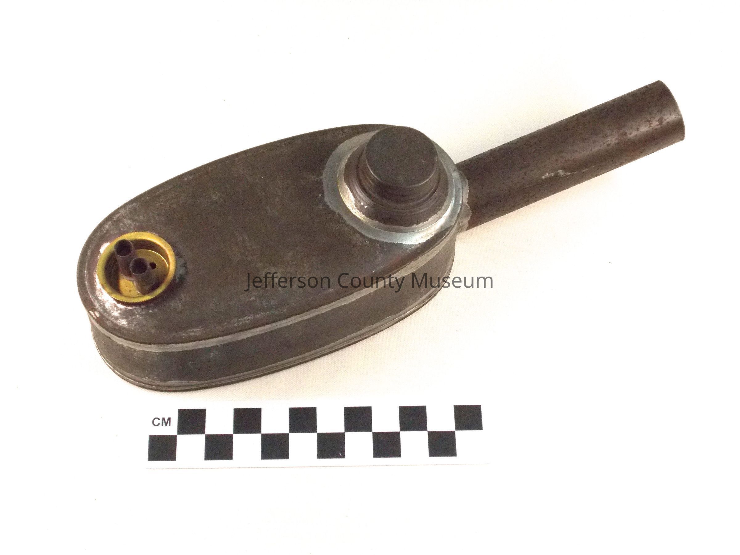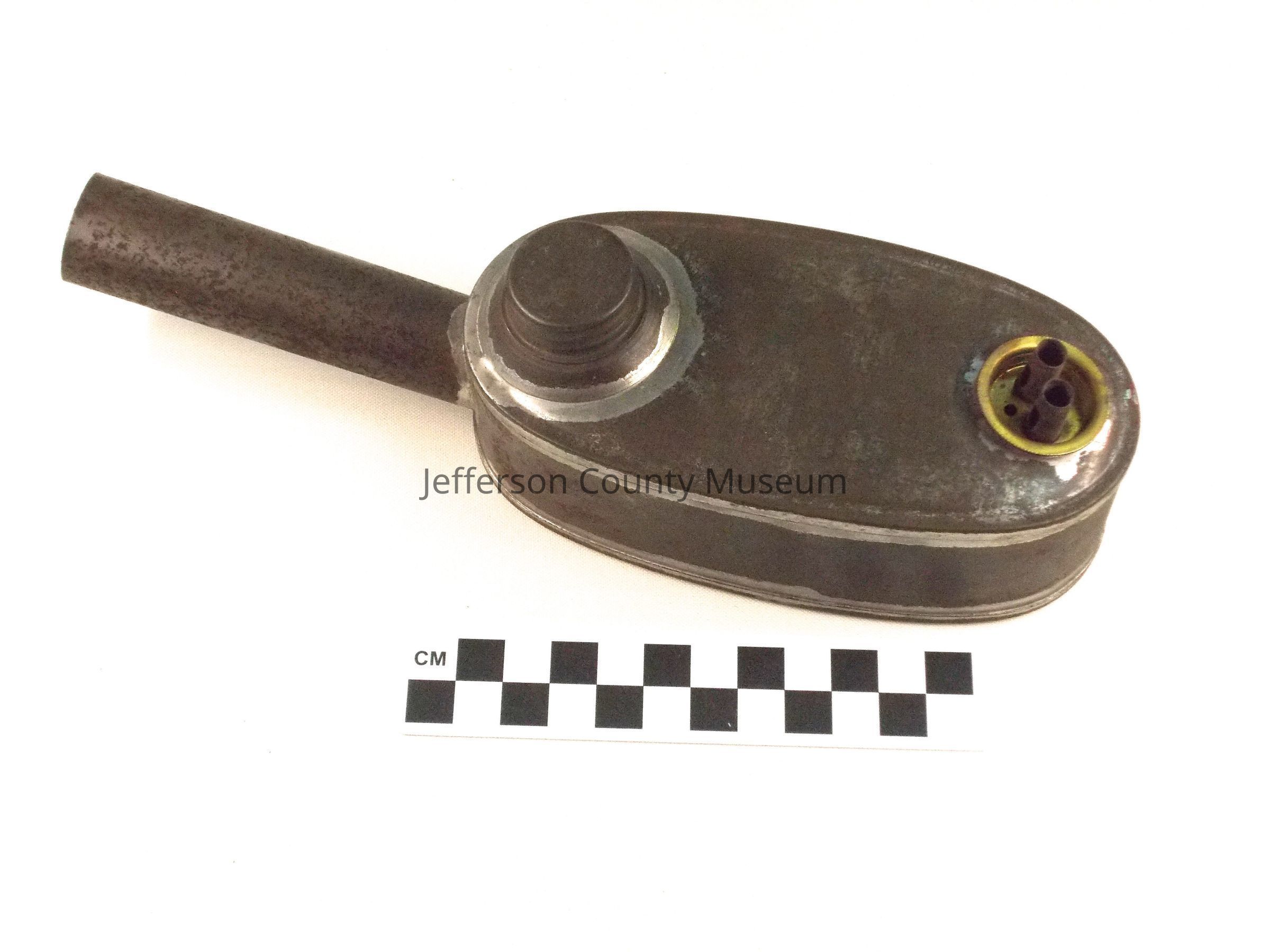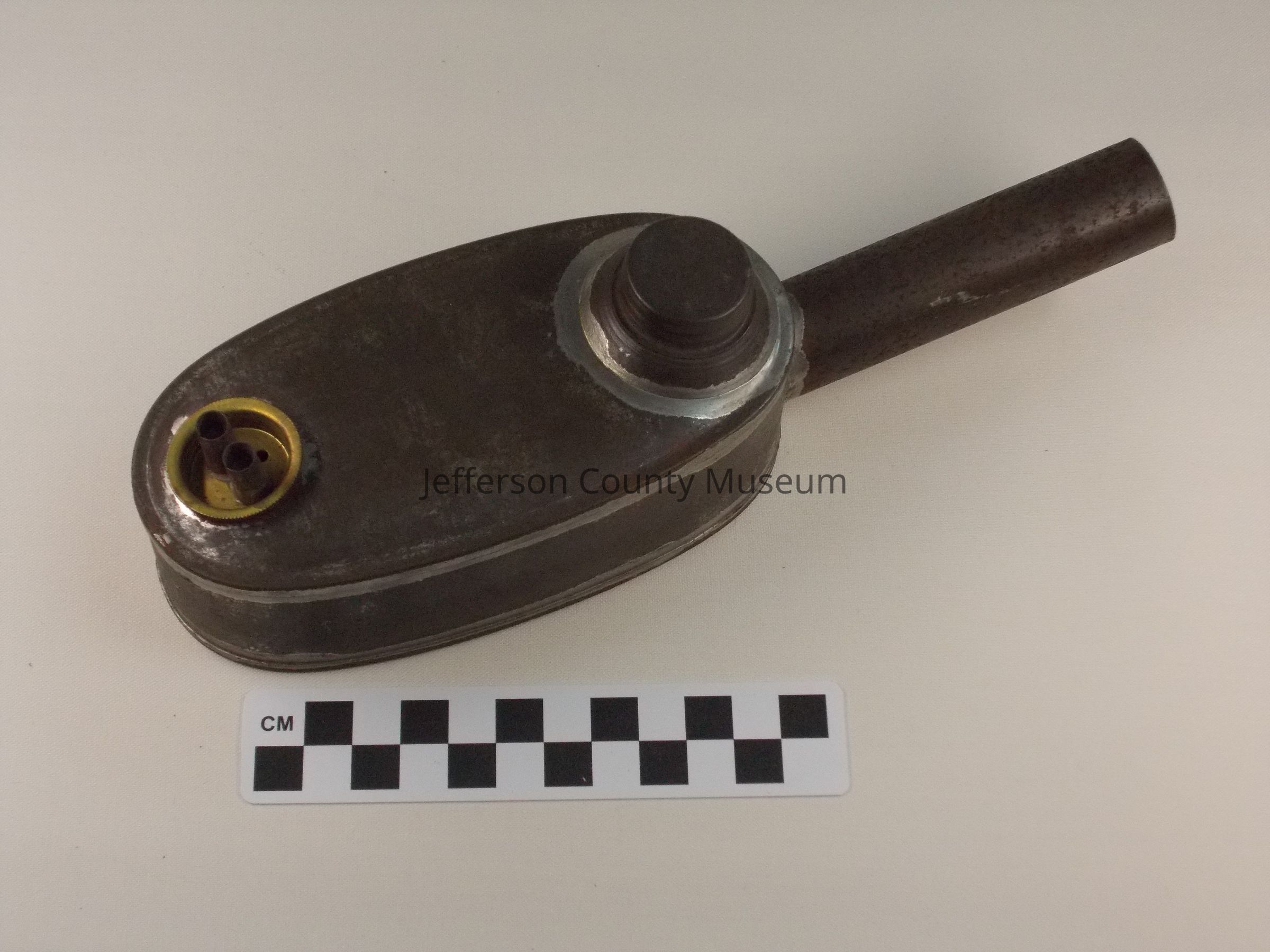 Baker's lamp - double wick lamp used to inspect the interior of brick ovens. Handle is a cone almost as long as the lamp presumably part of a handle that a wooden stick fit into.