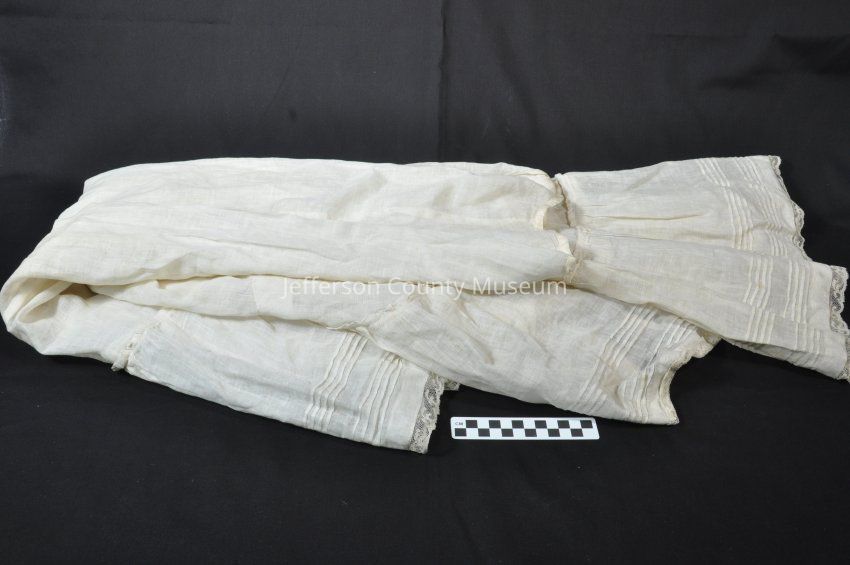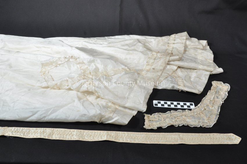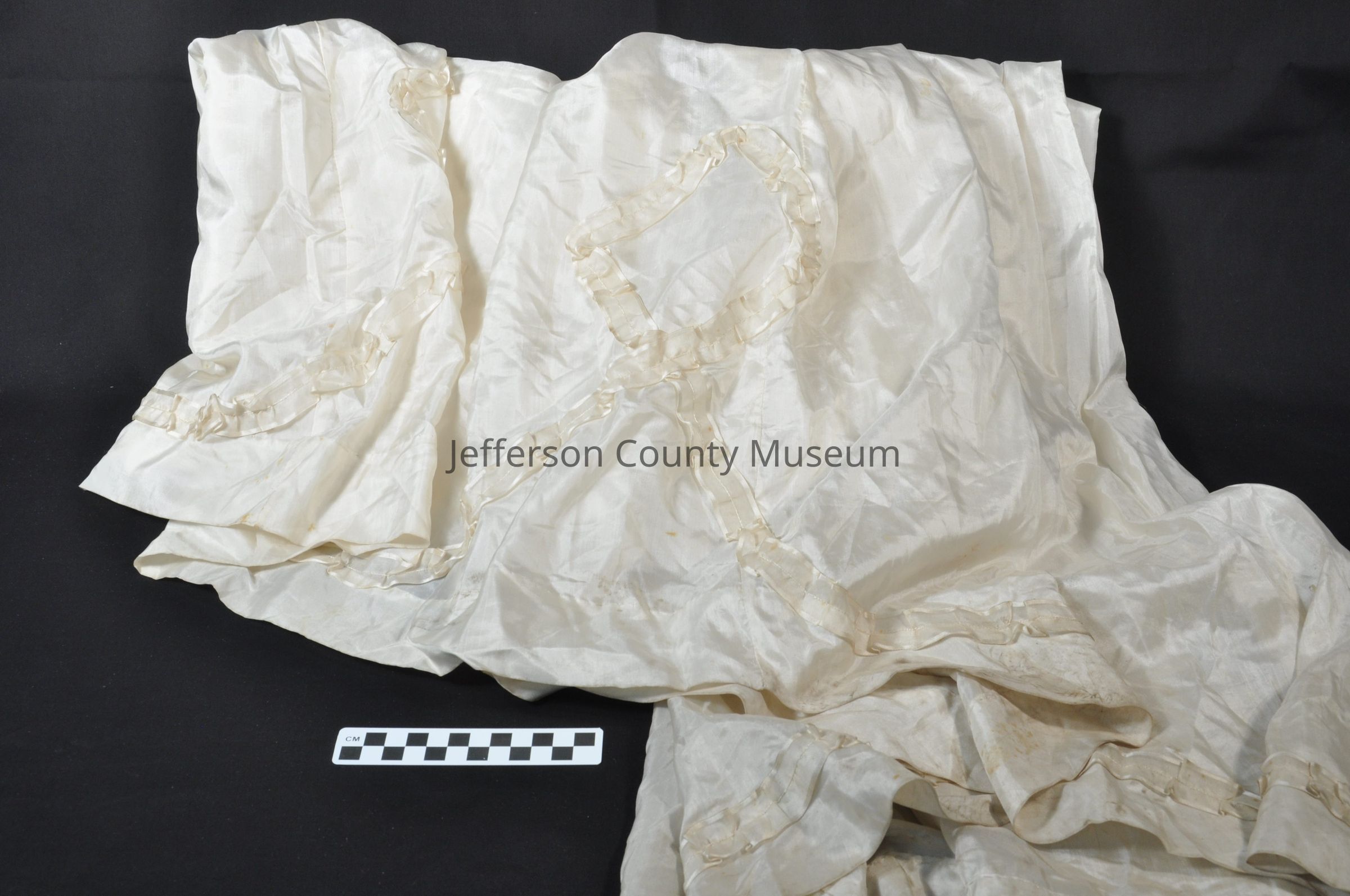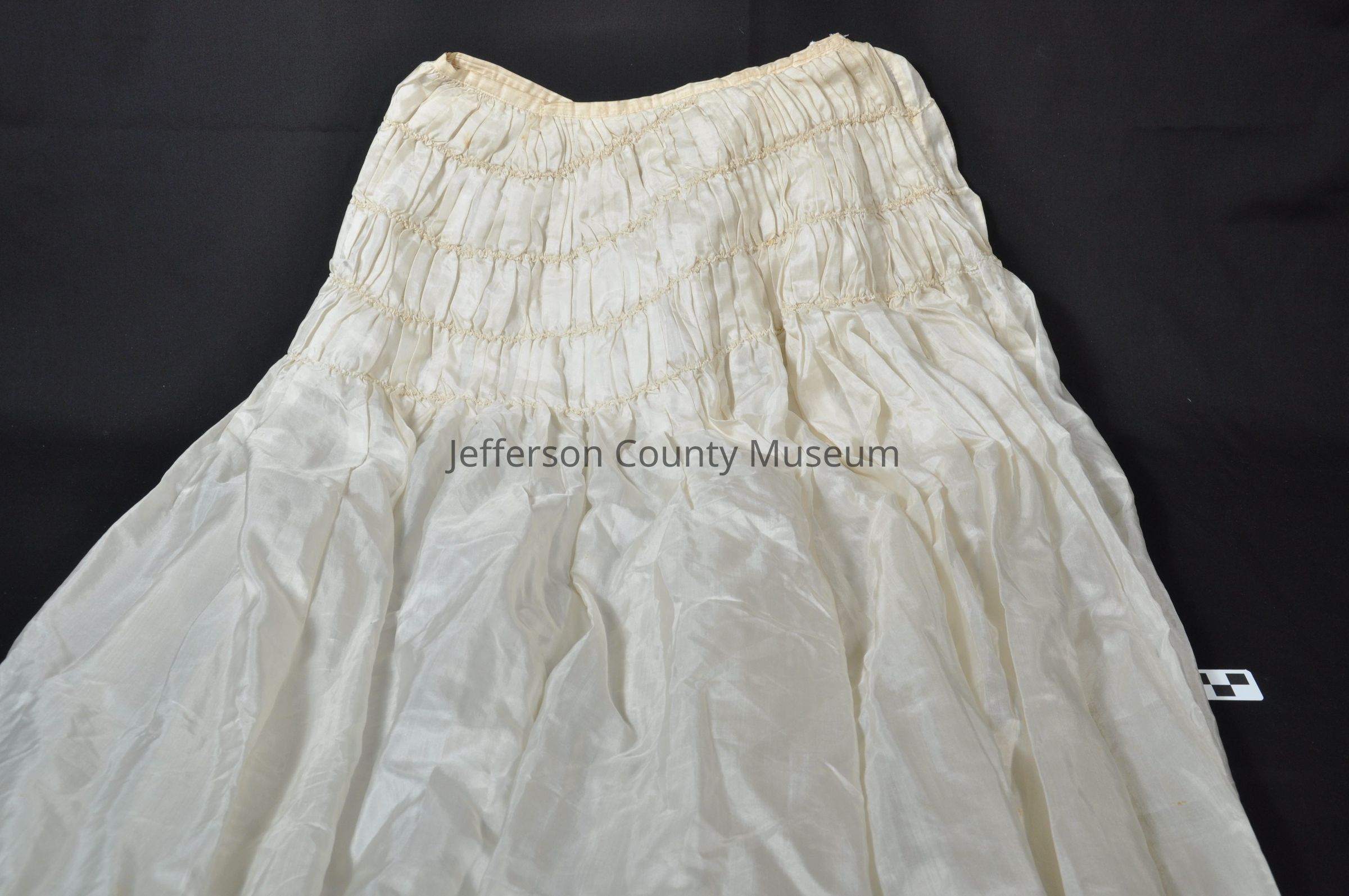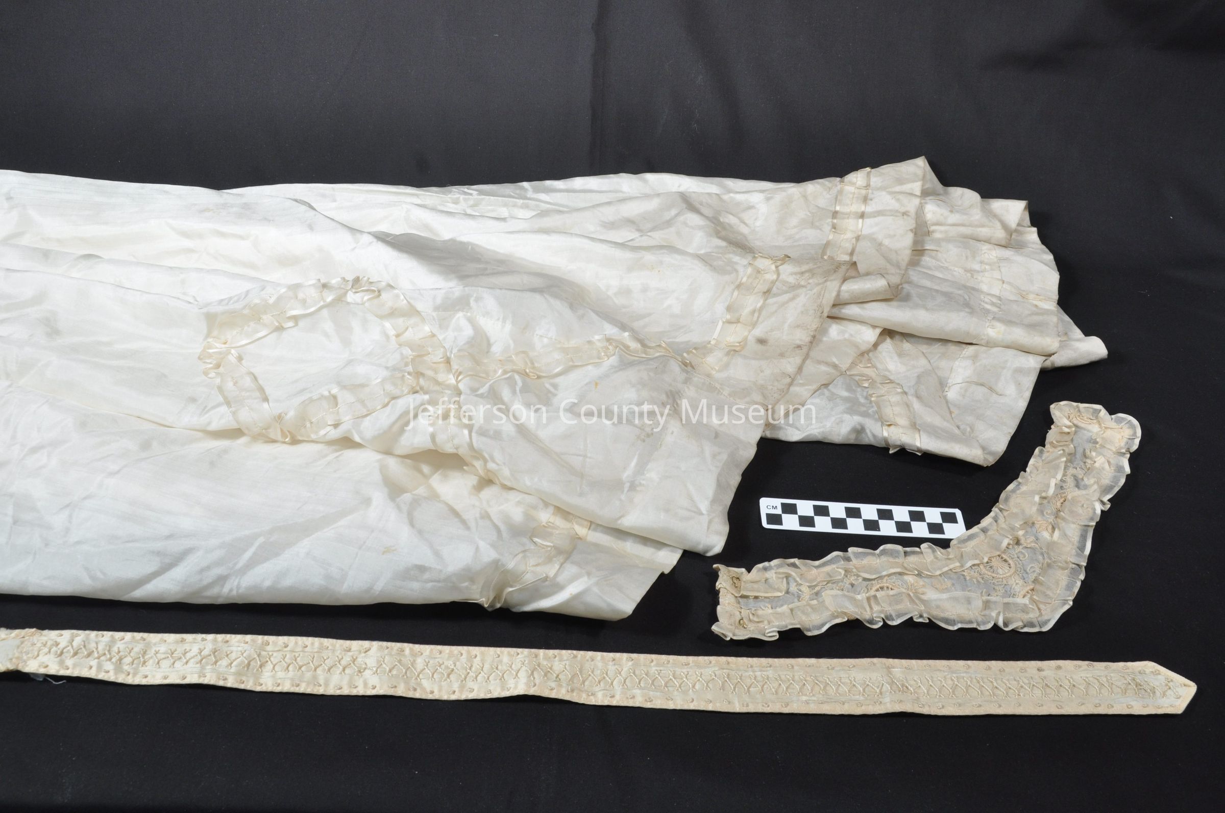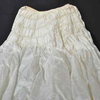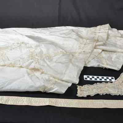 The top skirt has a criss-cross silk applique stitched into the bottom for design. The undergarment includes a small piece of lace trim added to the hem. Both the top skirt and undergarment have a train on the backside. The top skirt has metal clasps on the backside.