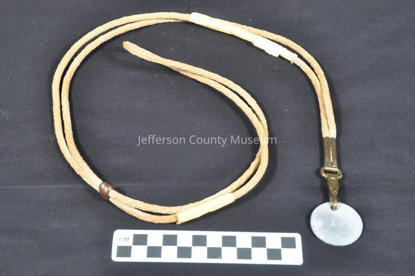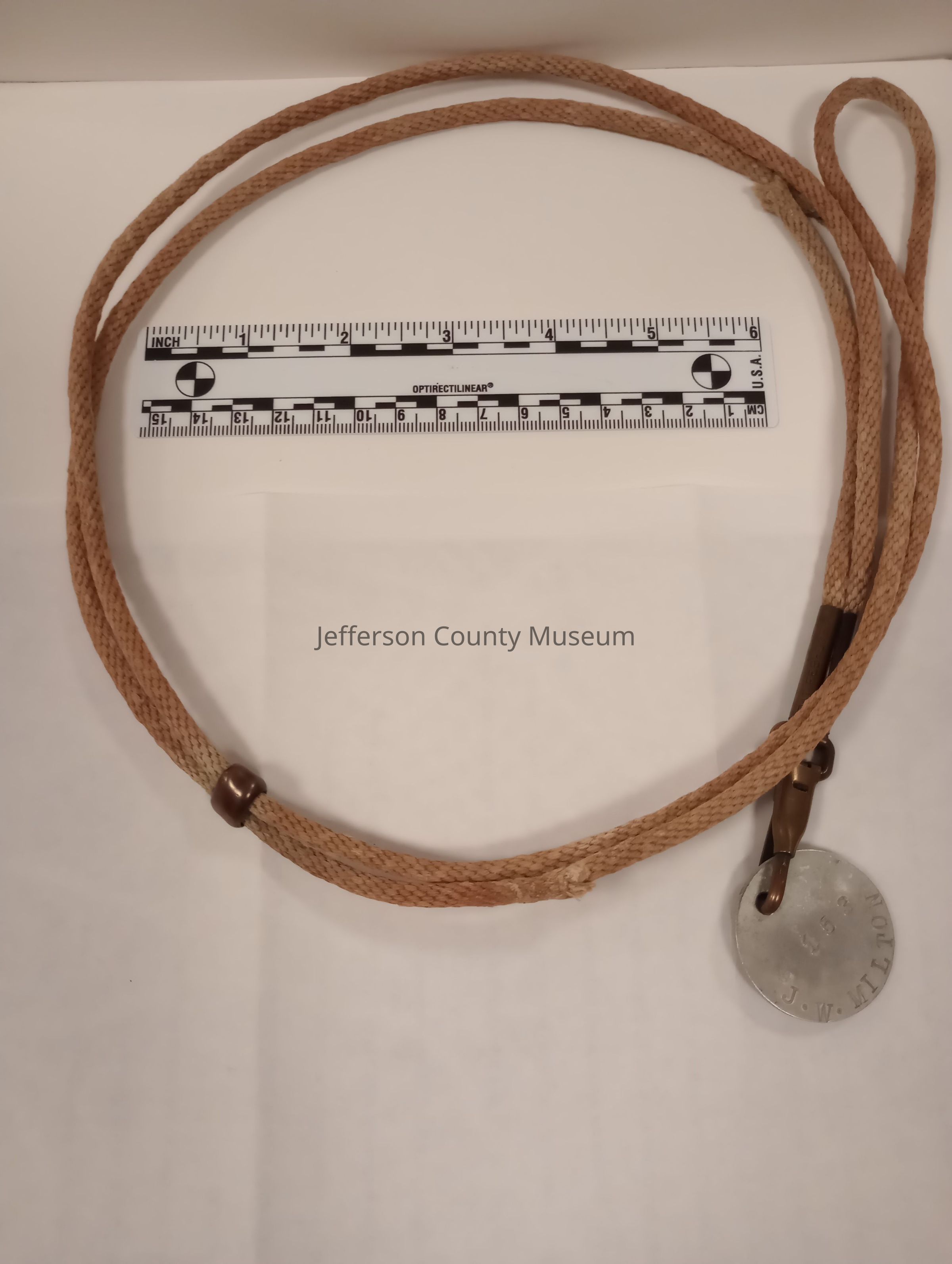 World War I circular, aluminum identification tag belonging to James W. Milton, the donor's father-in-law; on front of tag is "153" in the center and "J. W. Milton" along the arc at the bottom and on back of tag is "CO I 30" in the center and "547586" along the arc at the left side of the bottom