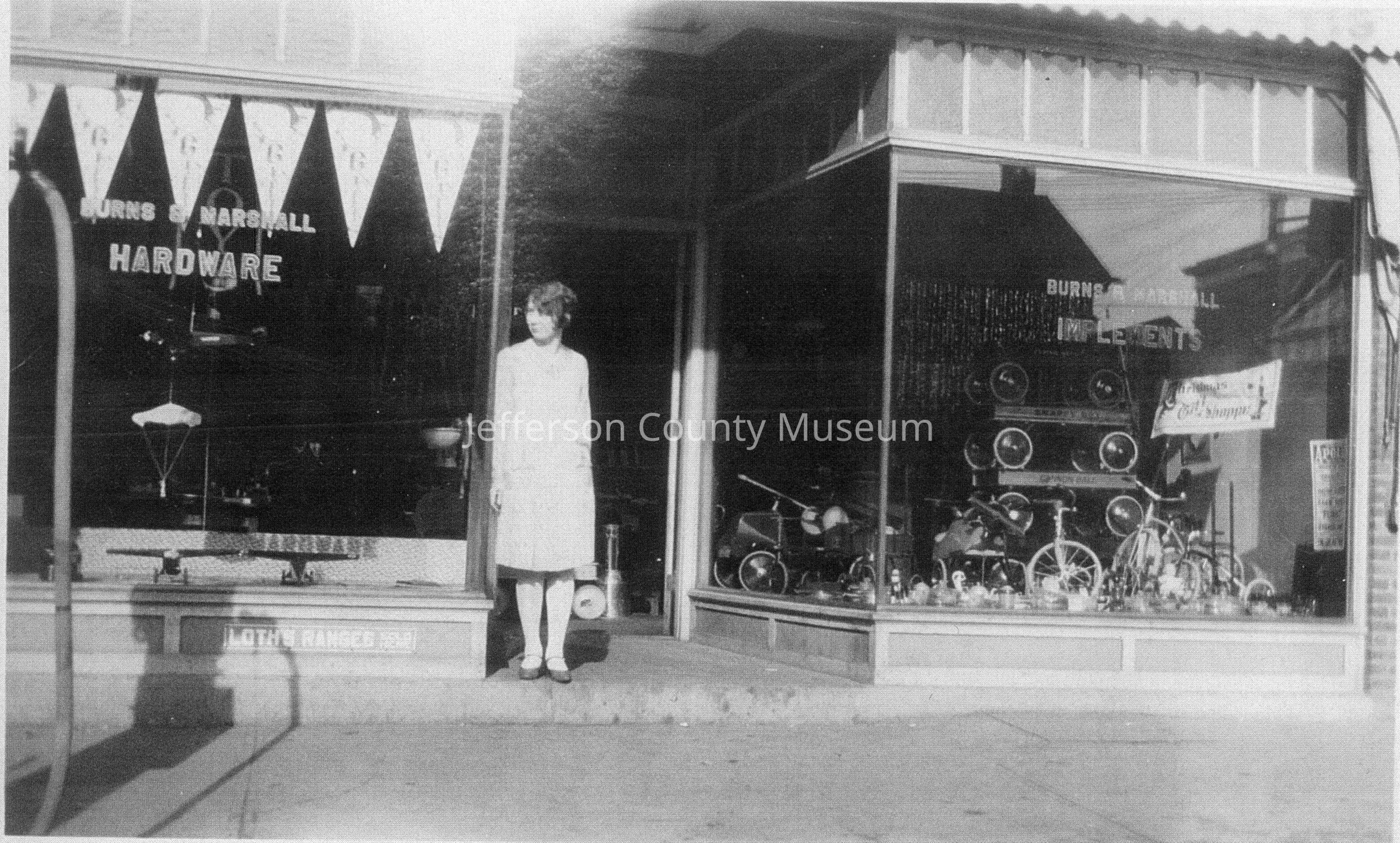 Nellie Marie Pine standing in front of Burns and Marshall Hardware store on West Washington Street.
