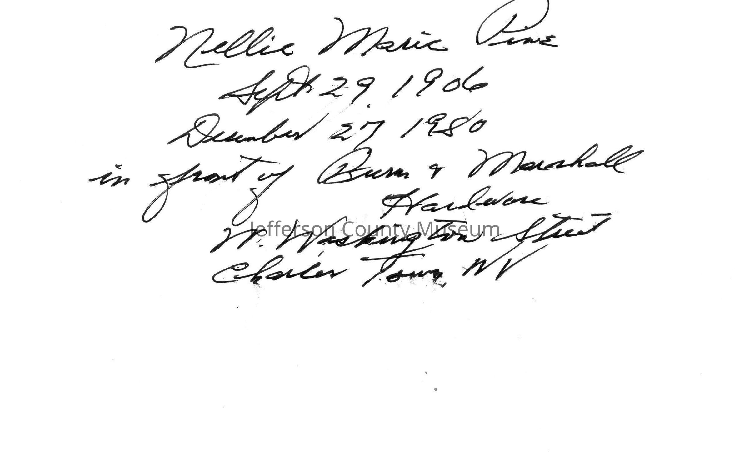 Verso reads: "Nellie Marie Pine, Sept. 29, 1906, December 27, 1980, in front of Burns & Marshall Hardware, W. Washington Street, Charles Town, WV"Acquisition