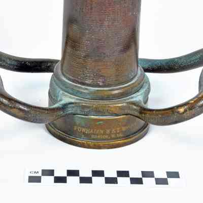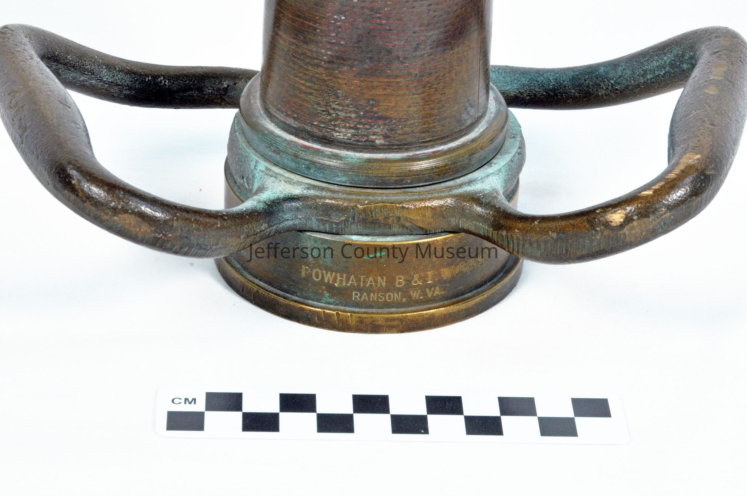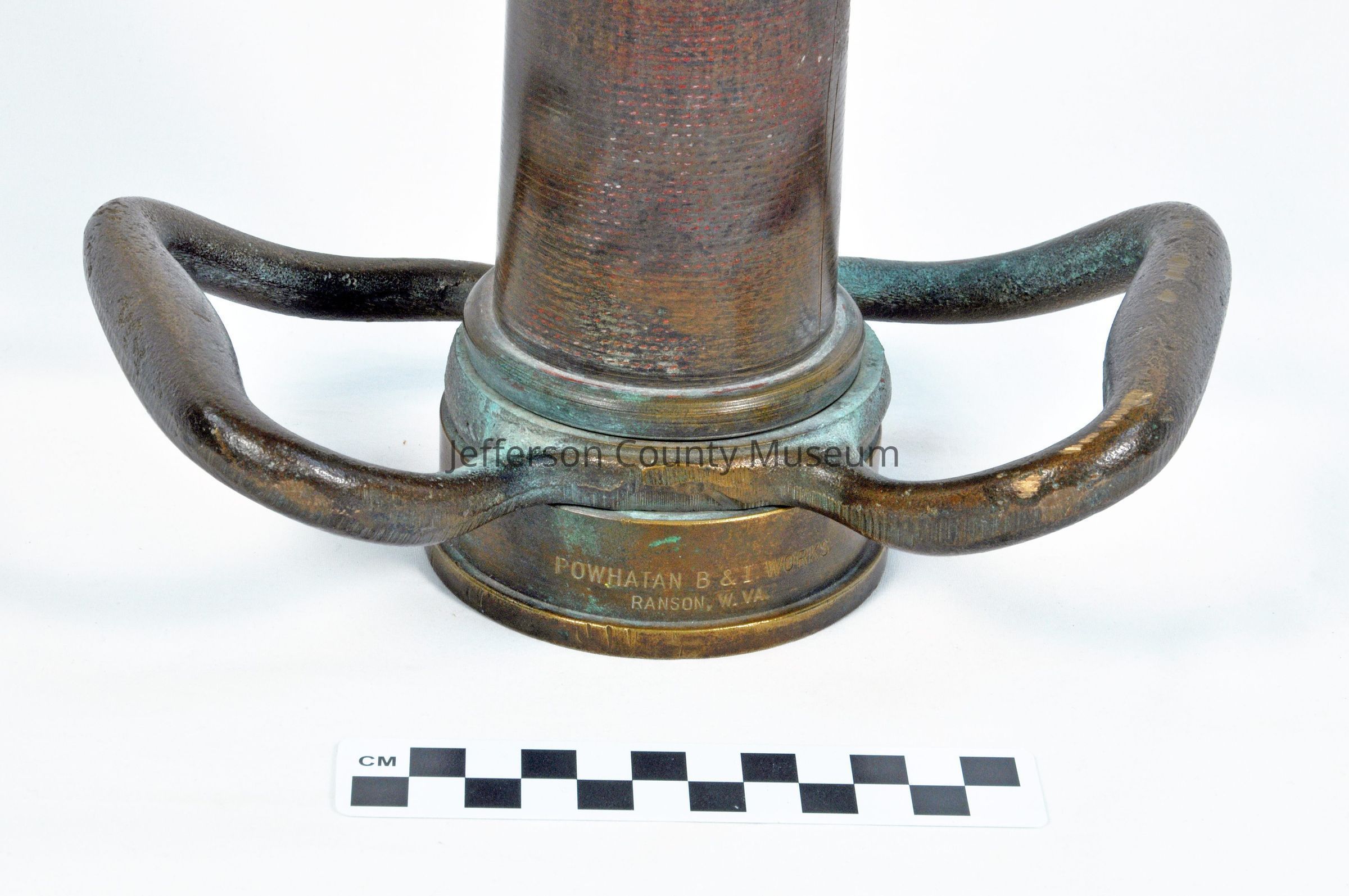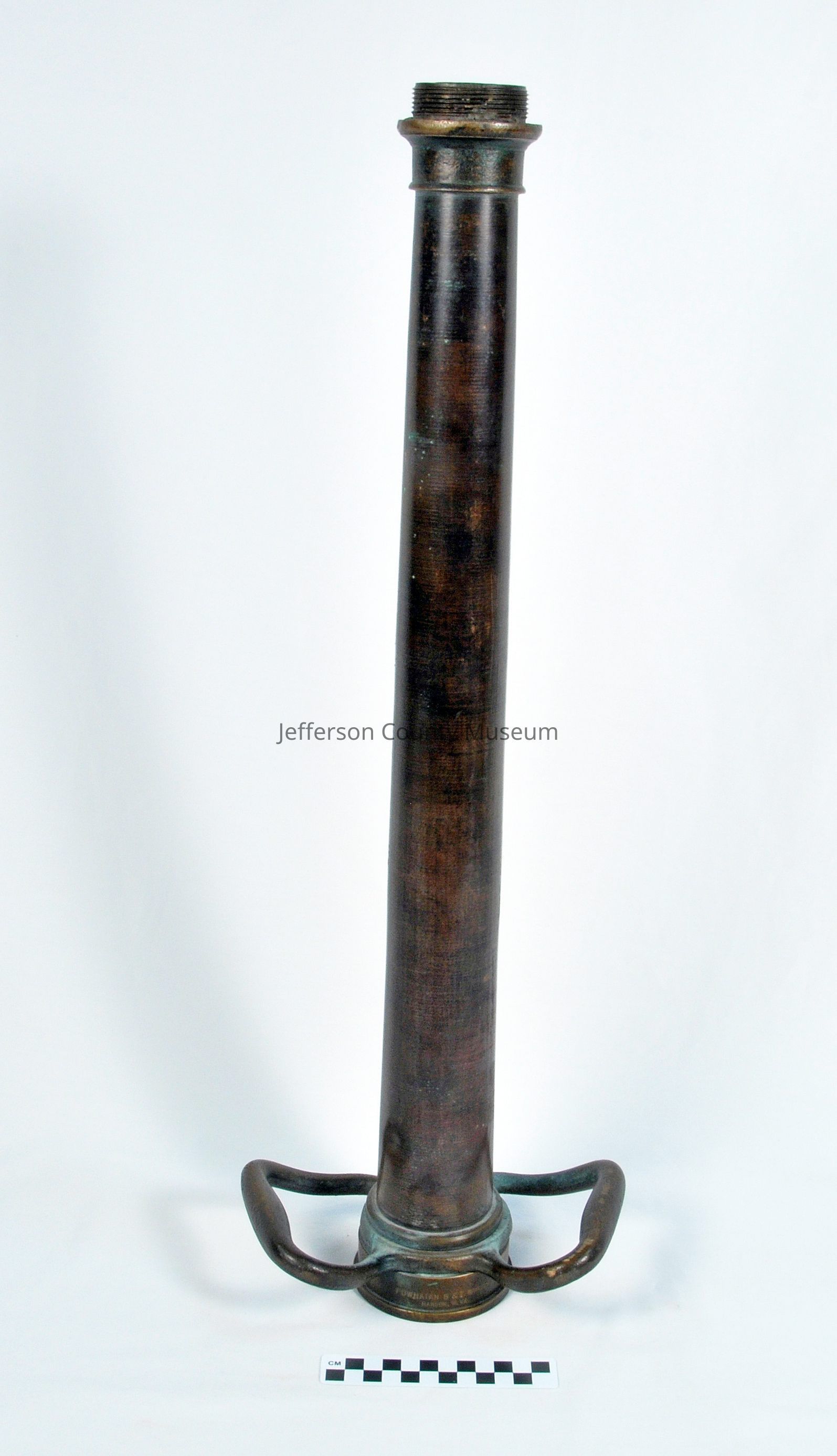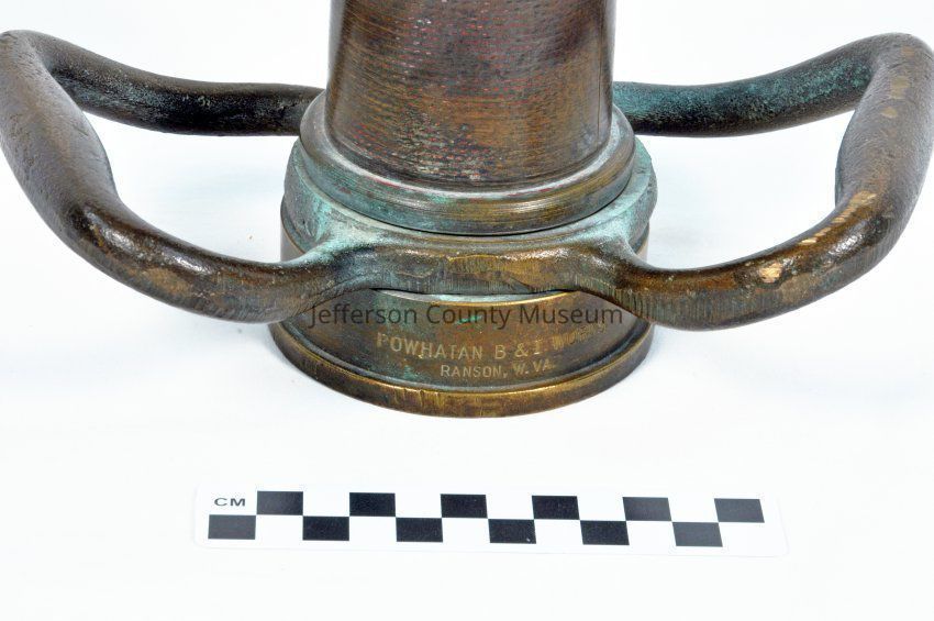 Brass play pipe with two brass swiveling handles at the base; a collar at the base is stamped with Powhatan B & I Works, Ranson, W. Va., on one side and 11-60 (date of manufacture, November 1960) on the opposite side. Pipe is a tapered smooth-bore cylinder with threads inside the collar at the base where a fire hose is attached; at the opposite end, threads for attaching a nozzle are on the outside of the cylinder.Acquisition