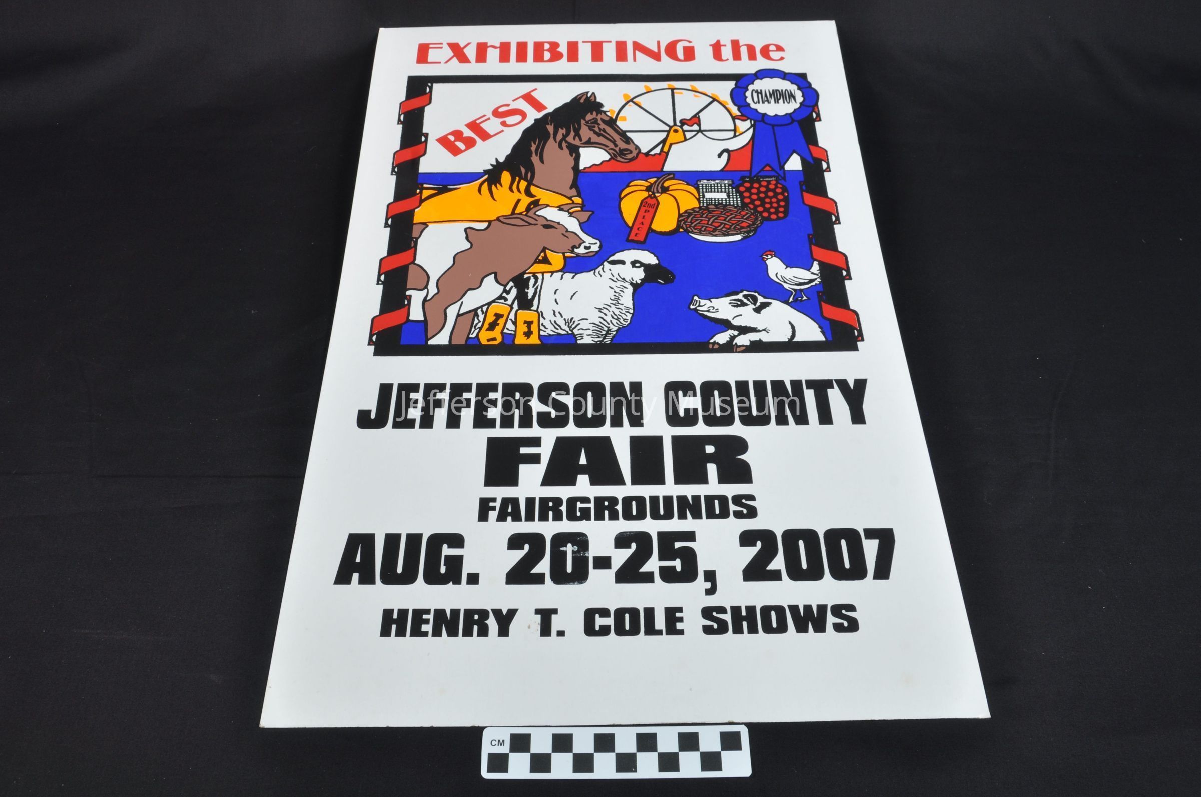 Jefferson County Fair poster: "Exhibiting the Best". Screen printed by Henry T. Cole Shows. Colors of red, blue, black, and brown on white background, picturing ferris wheel, horse, cow, sheep, pig, chicken, pumpkin, canned goods, and a pie.Acquisition