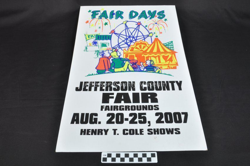 Jefferson County Fair poster: "Fair Days". Screen printed by Henry T. Cole Shows. Colors of green, blue, orange, yellow, and black on white background; depicting a family of four sitting on grass watching fireworks with a ferris wheel and circus tent under the fireworks.Acquisition