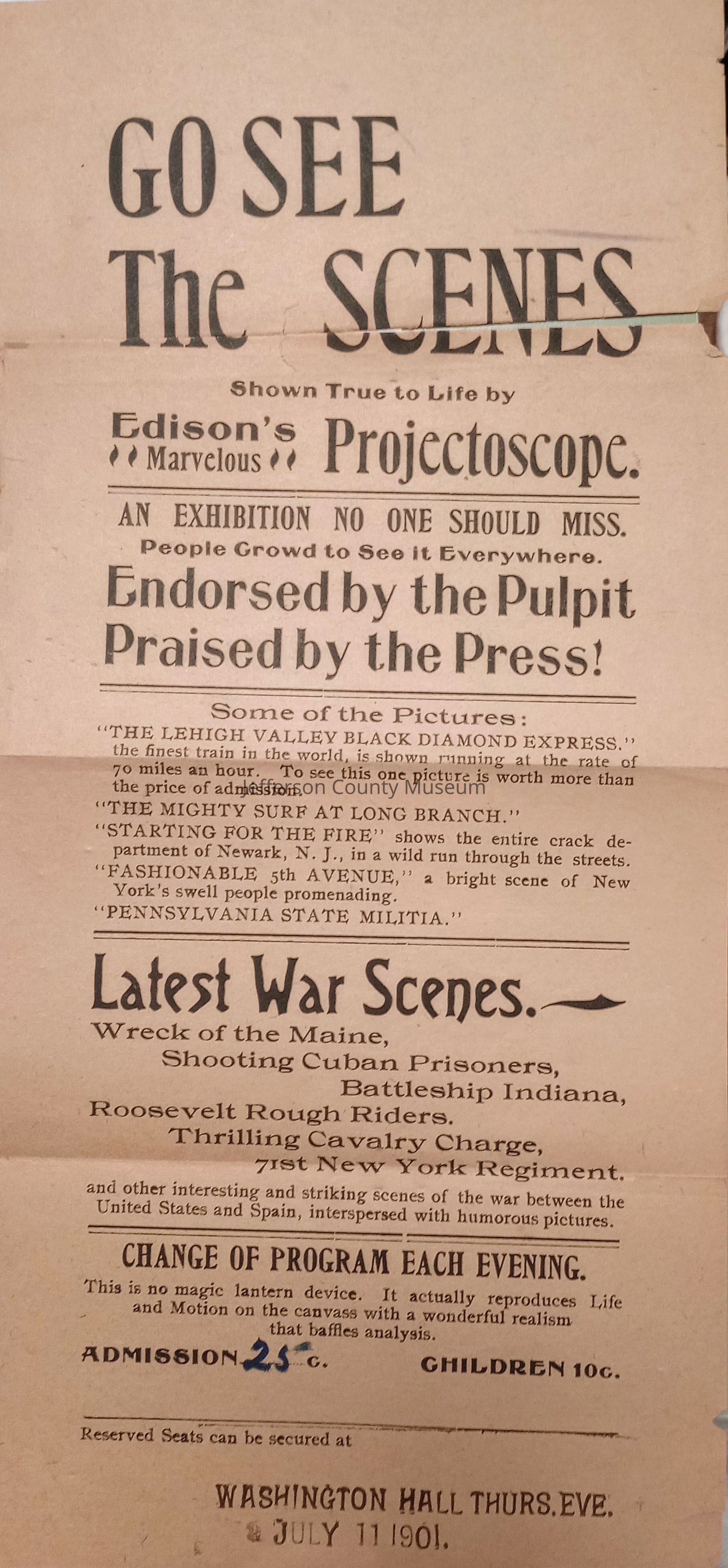 Printed broadside featuring a projectoscope exhibition at Charles Washington Hall. Advertises scenes from the Spanish American War among other "pictures."