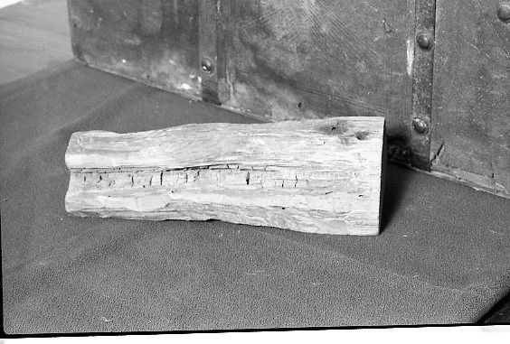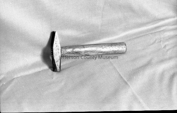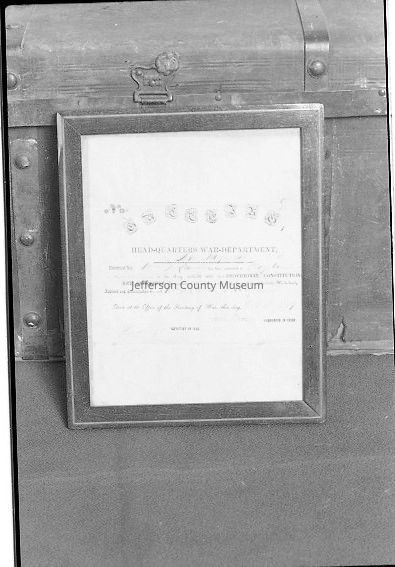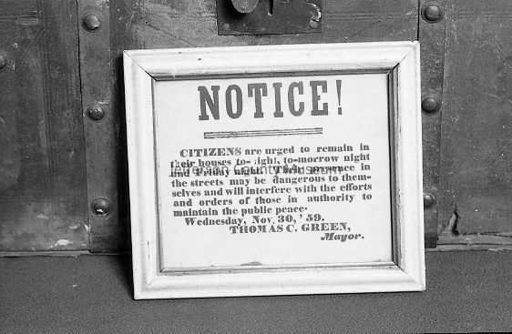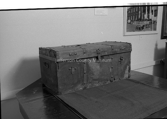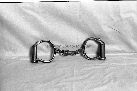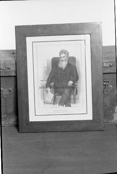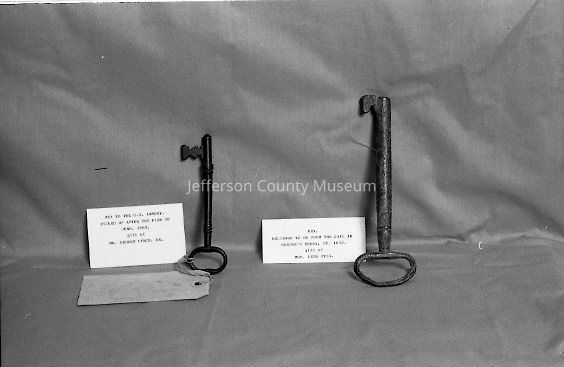 John Brown items, including pictures, keys, a trunk, handcuffs, a pick, a piece of wood, and a sign in the Jefferson County Museum collection, photographed for a publication by Pictorial Histories Publishing.