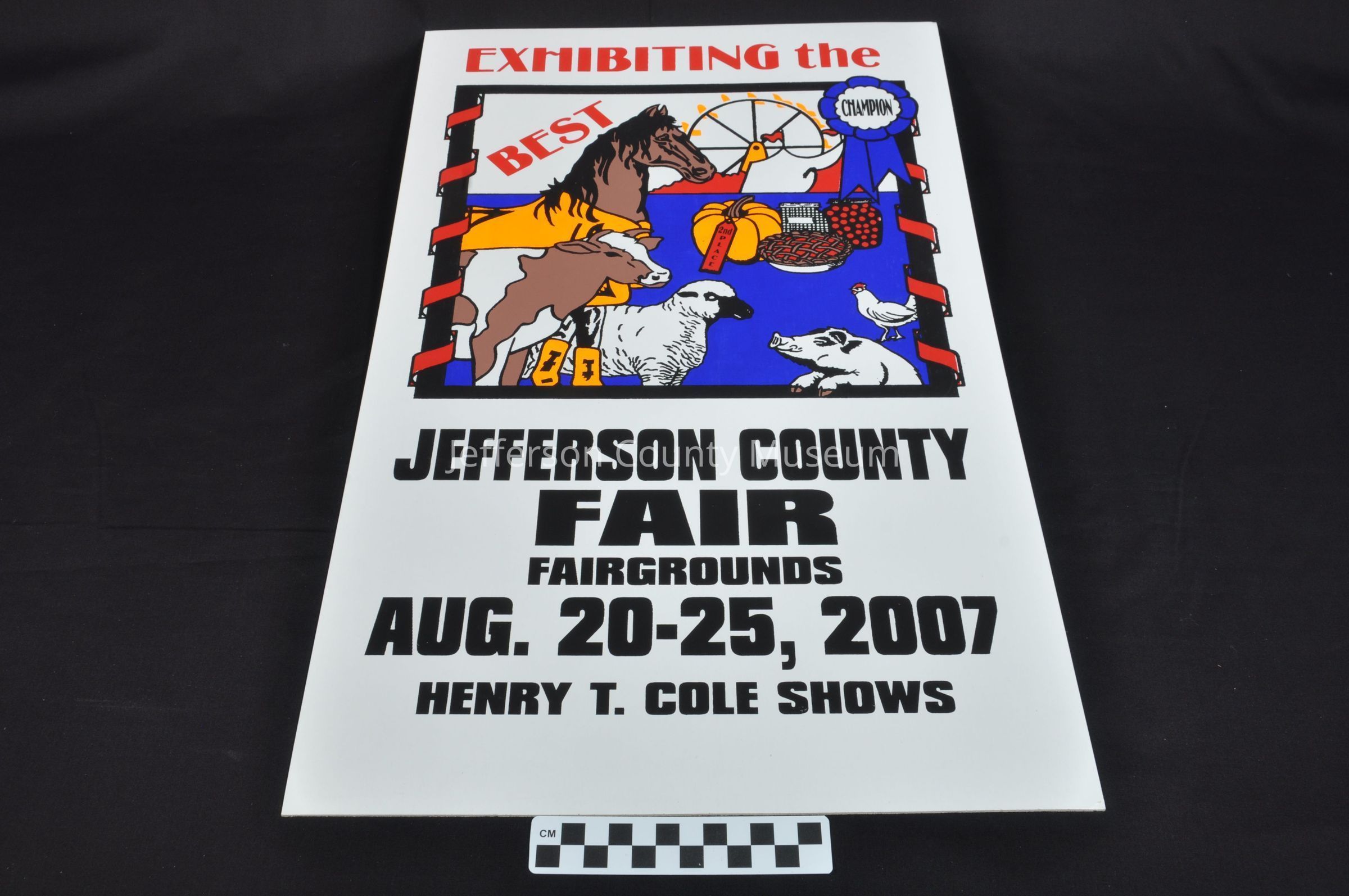 Jefferson County Fair poster: "Exhibiting the Best". Screen printed by Henry T. Cole Shows. Colors of red, blue, black, and brown on white background, picturing ferris wheel, horse, cow, sheep, pig, chicken, pumpkin, canned goods, and a pie.Acquisition