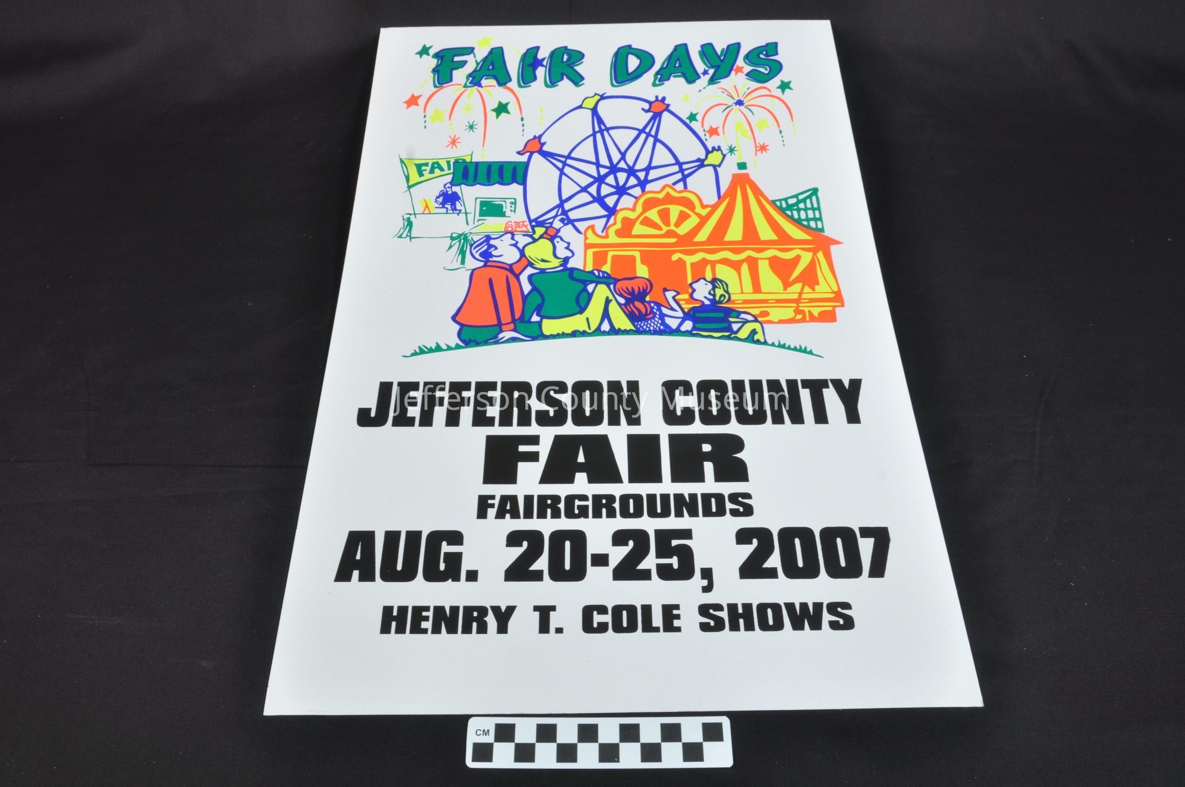 Jefferson County Fair poster: "Fair Days". Screen printed by Henry T. Cole Shows. Colors of green, blue, orange, yellow, and black on white background; depicting a family of four sitting on grass watching fireworks with a ferris wheel and circus tent under the fireworks. Printed in black at bottom: "JEFFERSON COUNTY / FAIR / FAIRGROUNDS / AUG. 20-25, 2007 / HENRY T. COLE SHOWS".Acquisition