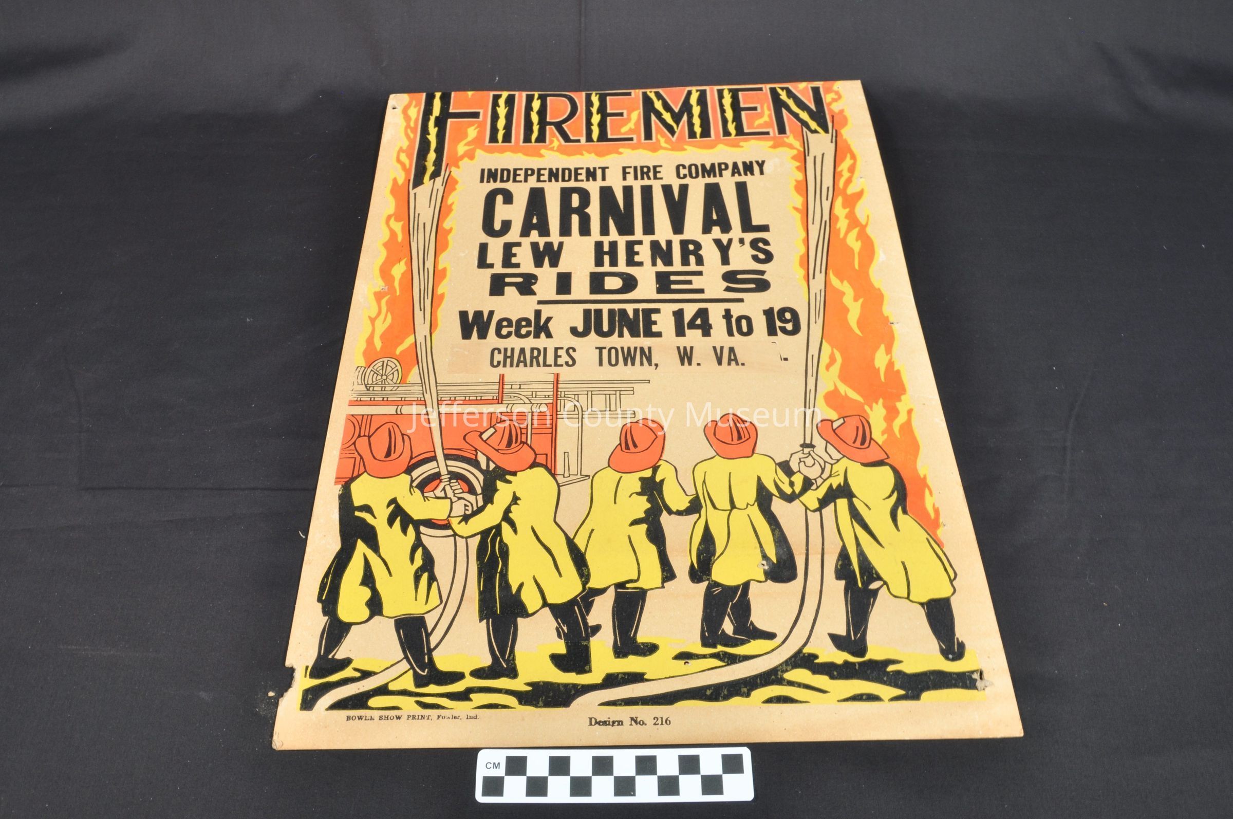 Poster advertising the Independent Fire Company Carnival. Colors of black, orange, and yellow on brown background. 5 firemen in yellow coats and orange hats holding firehoses, battling orange and yellow flames, with the back end of a fire engine. Printed in black and yellow: "FIREMEN"; printed in black: "INDEPENDENT FIRE COMPANY / CARNIVAL / LEW HENRY'S / RIDES / Week JUNE 14 to 19 / CHARLES TOWN, W. VA.". Printed in black along lower edge: "BOWER SHOW PRINT, Fowler, Ind. Design No. 216".Acquisition