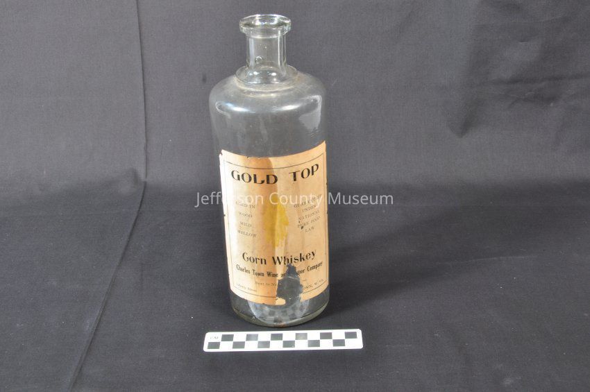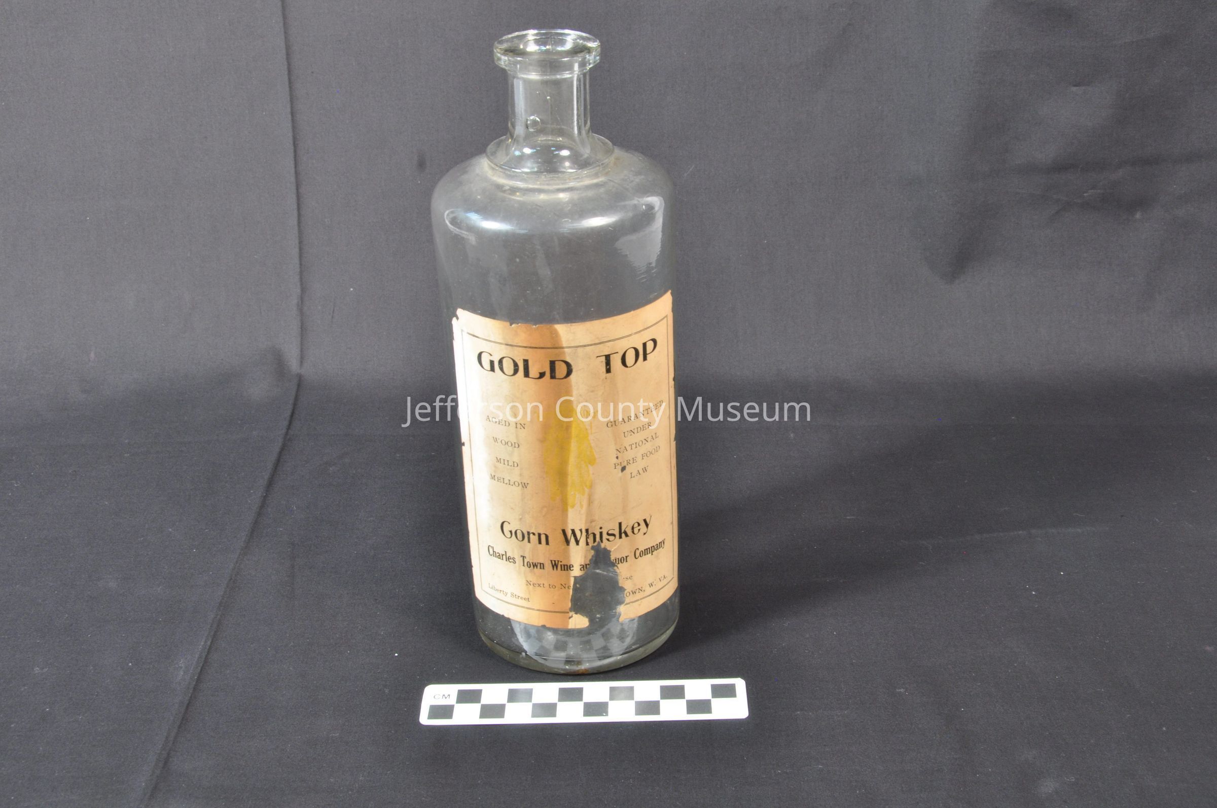 Clear glass bottle with paper label: "GOLD TOP Corn Whiskey" from the "Charles Town Wine and Liquor Company / Next to Ne[w Opera Hou]se". "AGED IN / WOOD / MILD / MELLOW". "GUARANTEED / UNDER / NATIONAL / PURE FOOD / LAW".Acquisition