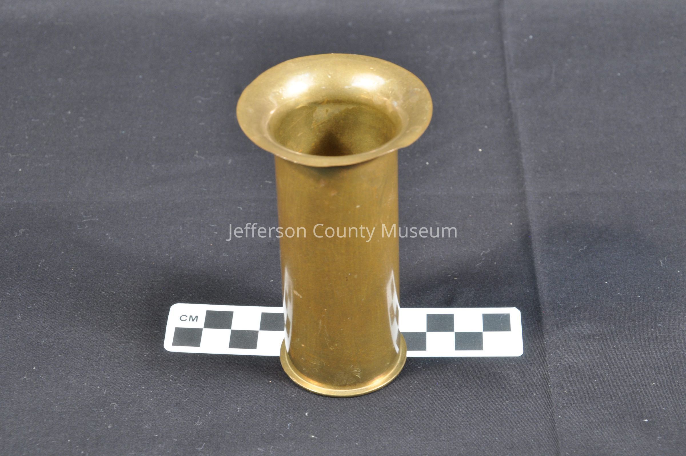 Casing of World War I artillery shell altered to have a flared opening. Incised in base: "U.S.N.G.F. / 7-19 / 1PDR.H / A.W.G. [with an anchor] M.K.". 7-19 was the date of manufacture.Acquisition