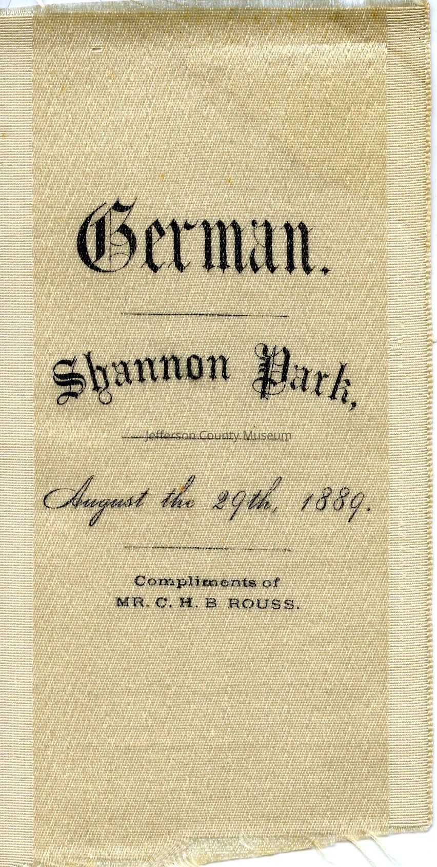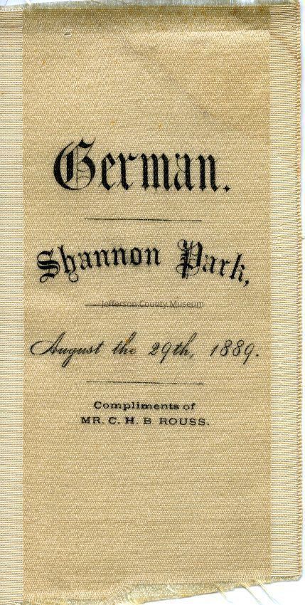 Cream-color silk ribbon bookmark. Printed in black on one side: "German. / Shannon Park, / August the 29th, 1889. / Compliments of / MR. C.H.B ROUSS." Possibly manufactured for a party favor for one of Mr. Rouss' parties at Shannon Park.Acquisition