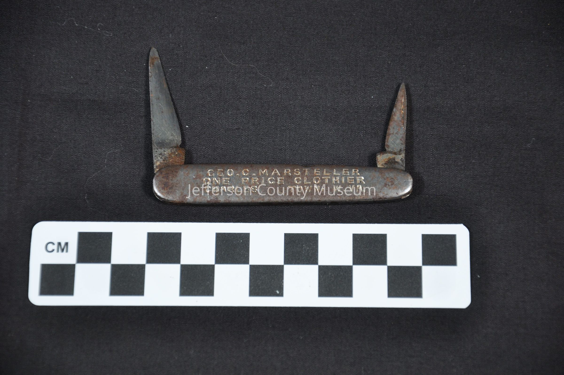 Pocket knife advertising a local business. Two blades, both well-worn. Tang on large blade stamped "DIAMOND" on one side and "Albert [additional letters obscured by rust] on other side. Cover & bolster are one piece, silver colored and stamped "Geo C. Marsteller / One Price Clothier / Charles Town, W. Va." Marsteller operated a business in Charles Town in the early 20th century.
