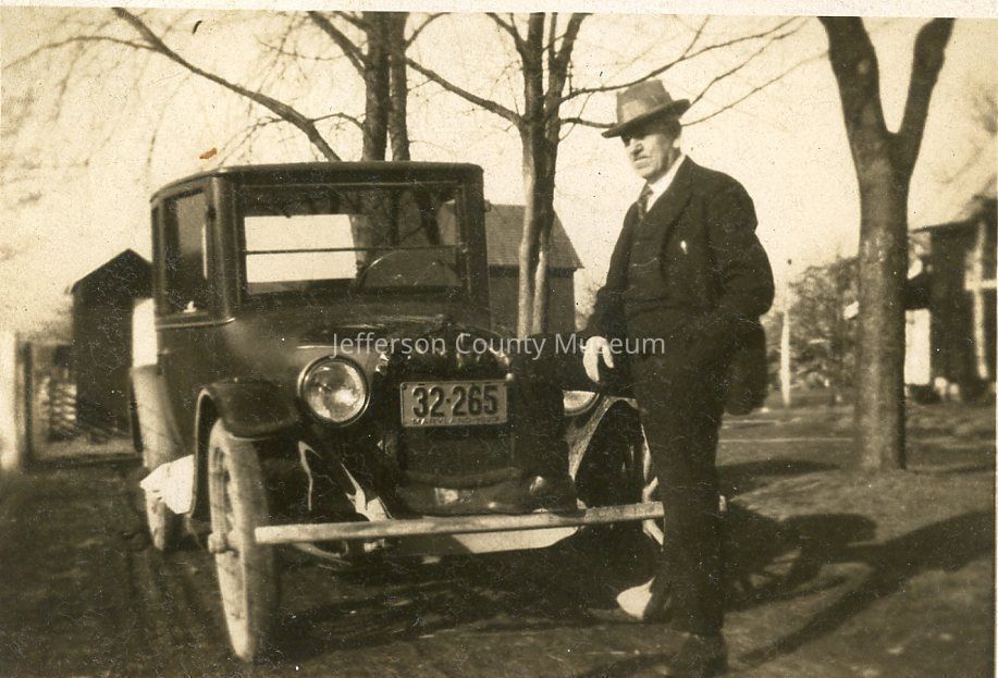 Jenkins-Melvin family photograph of a man in a hat standing in front of a car