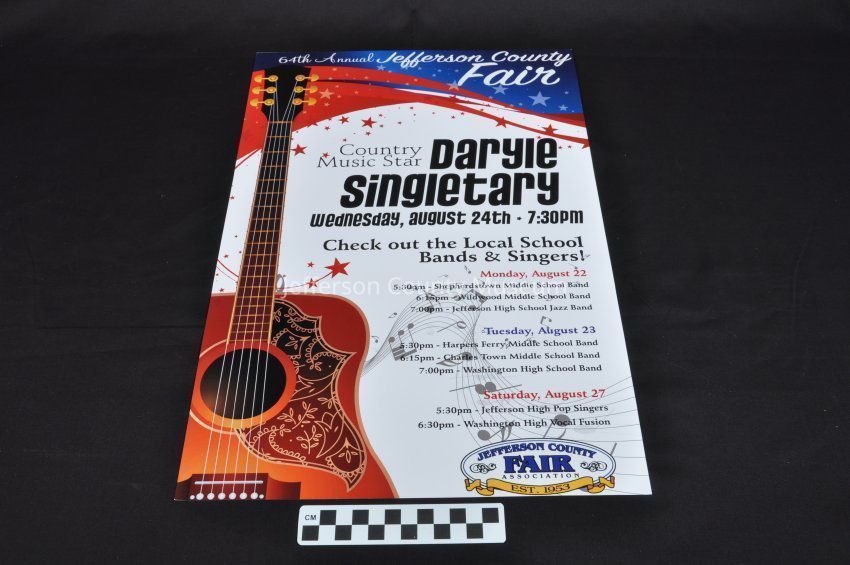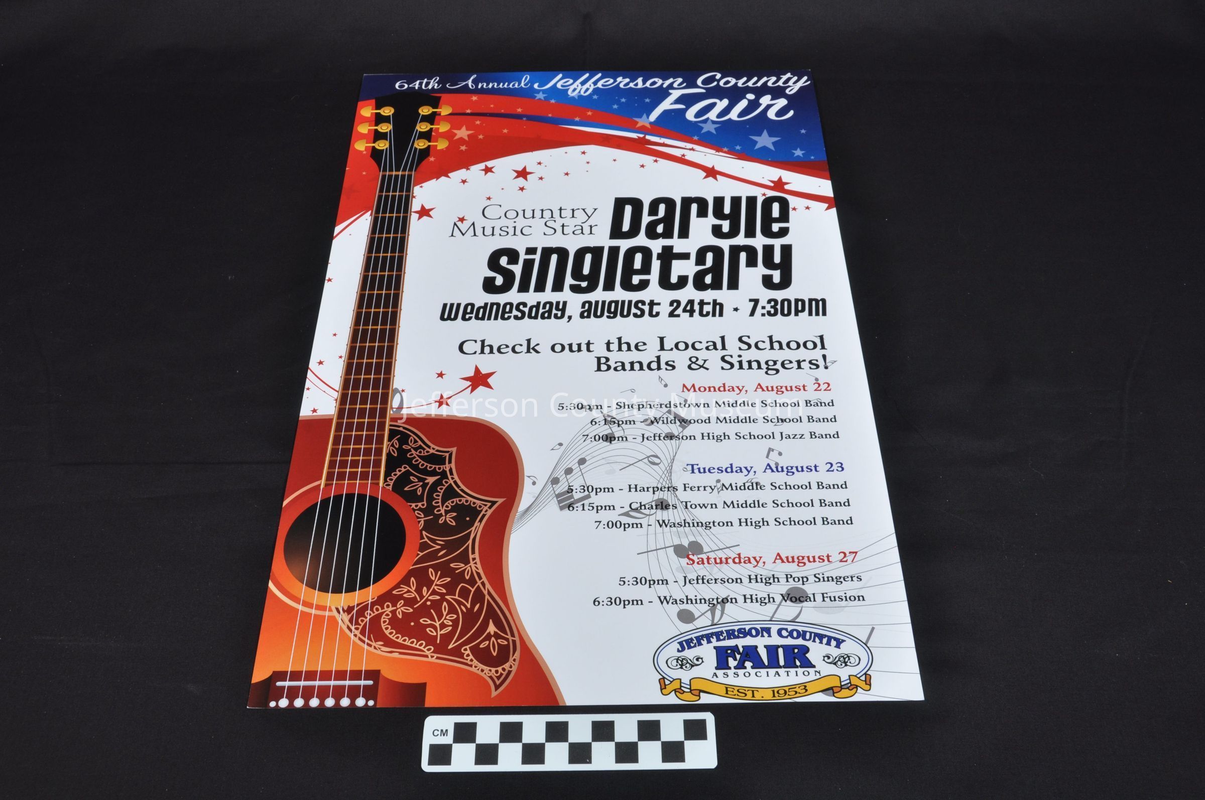 Poster advertising events for the 64th Annual Jefferson County Fair. Poster has white background with guitar along left edge and Jefferson County Fair Association logo in lower right corner. Poster advertises local school band and singer performances, along with performance by country music star, Daryle Singletary on August 24th.Acquisition
