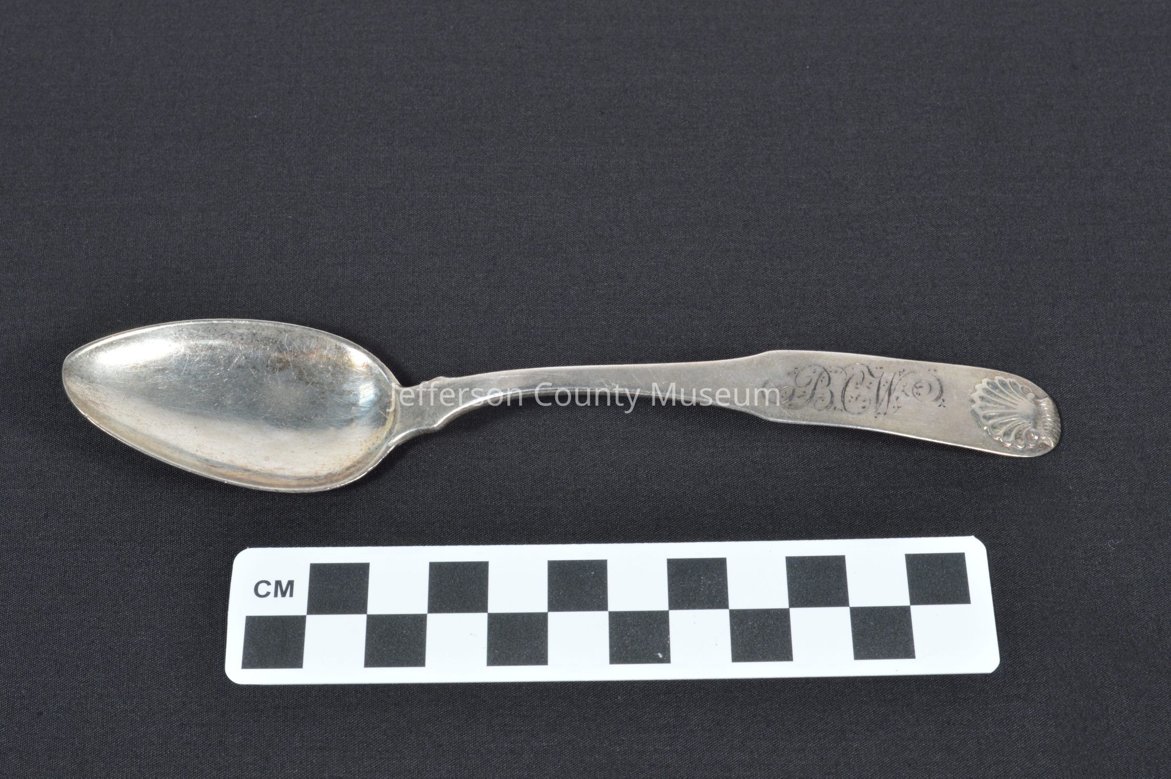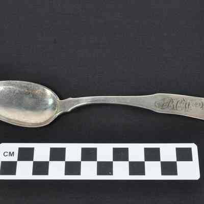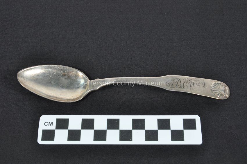 Sterling silver soup spoon, circa 1820; engraved "BCW" in script at base of handle, above an impressed shell, for Bushrod Corbin Washington I; by Charles A. Burnett, a leading silversmith in Washington, D.C.; "C. A. BURNETT', silversmith mark, on reverse of handle. Used at Clay Mont (Claymont), built by Bushrod Corbin Washington I in Jefferson CountyAcquisition