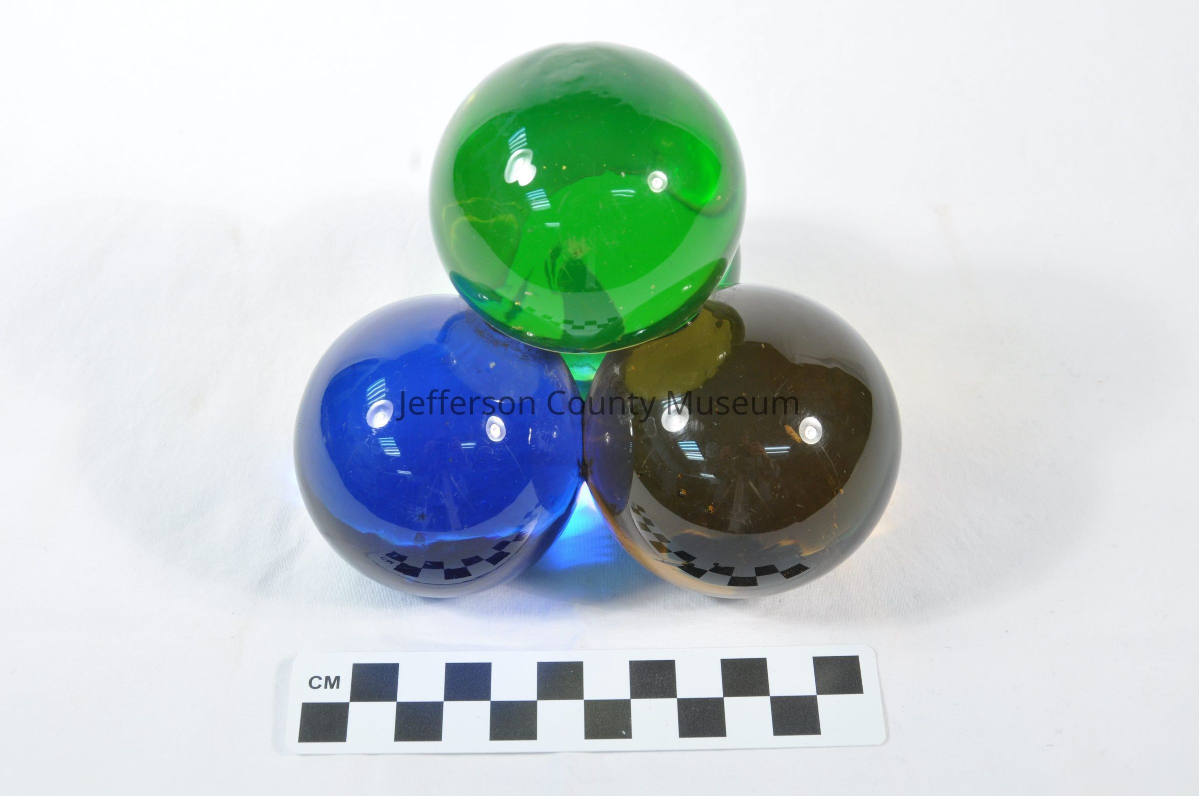 Paperweight comprised of four colored glass spheres; green, blue, and amber spheres on bottom; yellow sphere on top; overall a triangular shape.