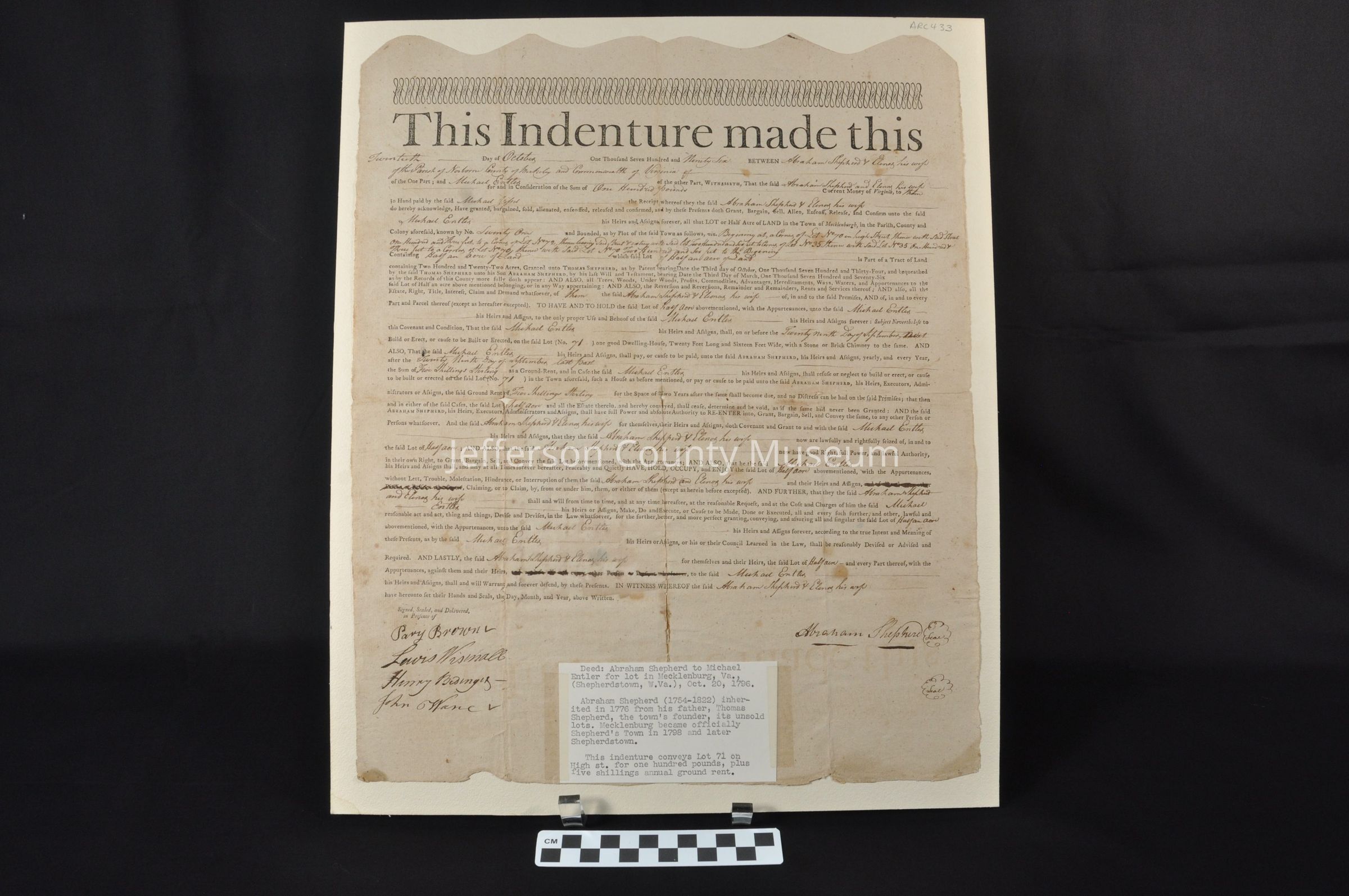 Deed dated October 20, 1796, between Abraham and Elinor Shepherd and Michael Entler for lot 71 on High Street in Mecklenburg, Virginia (Shepherdstown, West Virginia) for 100 pounds plus 5 shillings annual ground rent. 46 cm x 38.4 cm.Acquisition