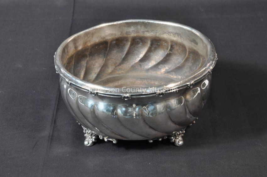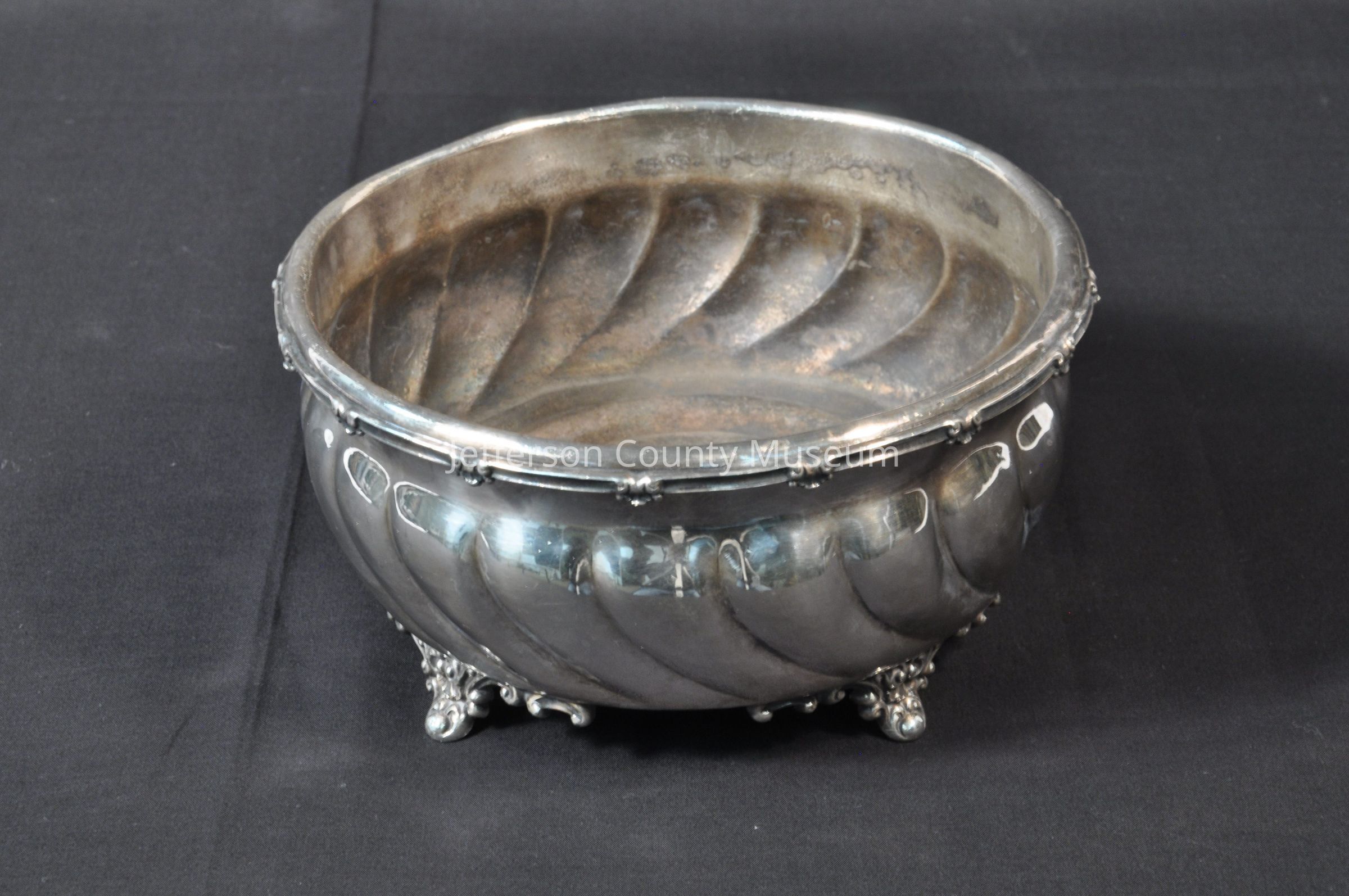 Silver-plated bowl on four feet. "987" engraved in base and words: "HIGH GRADE METAL", along with maker's mark. No lid.