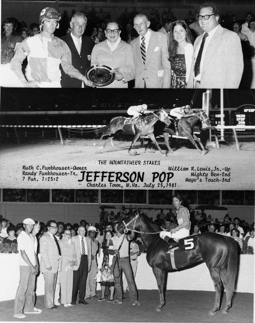Jefferson Pop, first place winner, and Mighty Ben, second place, at the Mountaineer Stakes on July 25, 1981