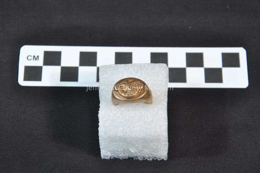 10K gold ring with "ruptured duck" emblem (flying eagle within a wreath), given to World War II service members who were honorably discharged. Approximate size 5 or 6.Acquisition