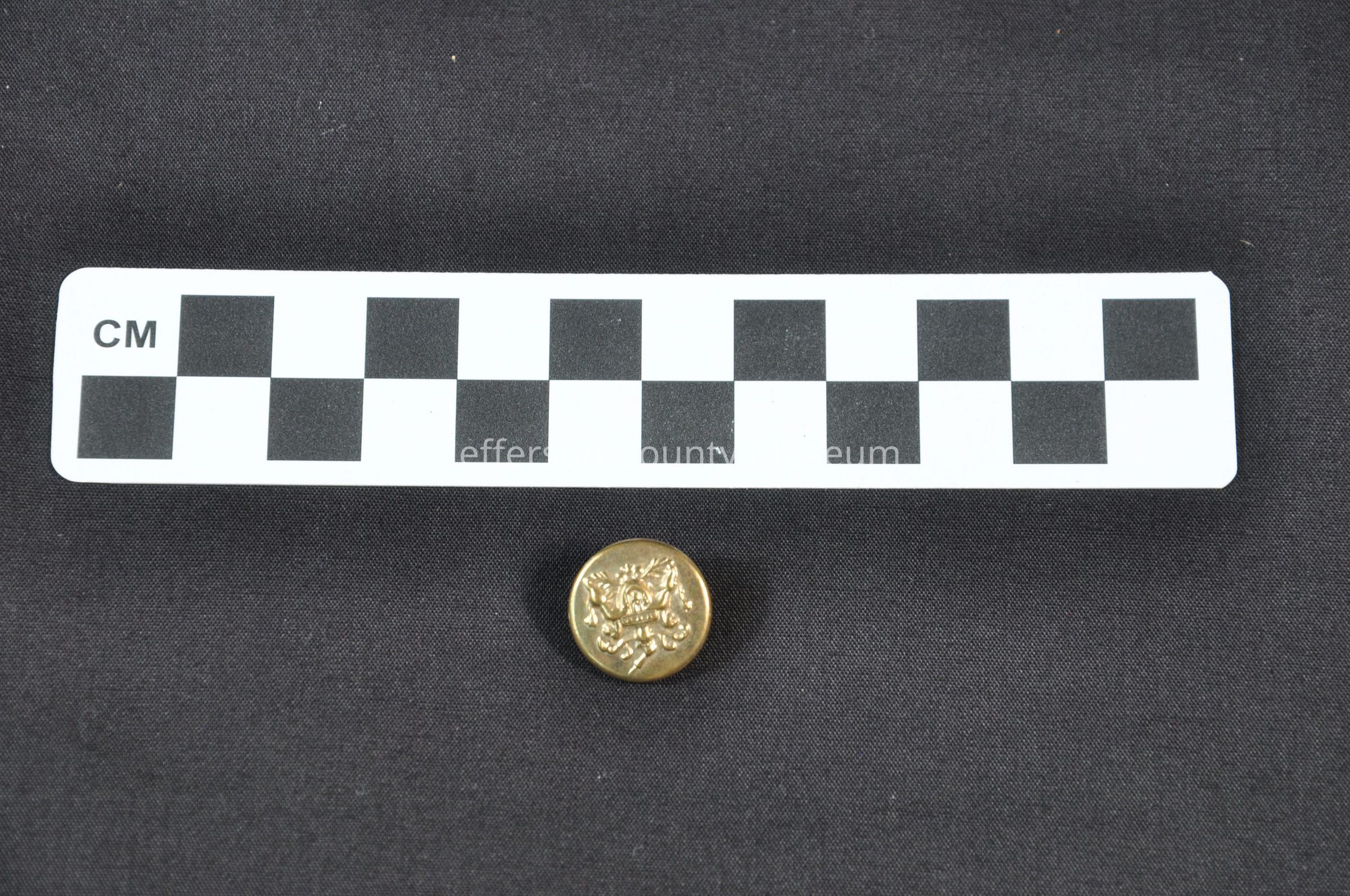 Gold-colored shank-type metal button has an heraldic coat-of-arms type emblem on the obverse. Reverse has four "W"s around the shank. Emblem is the same as that on objects number 255. Buttons may have been military uniform or nurse's uniform buttons, but is not verified.Acquisition