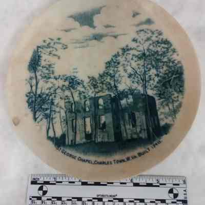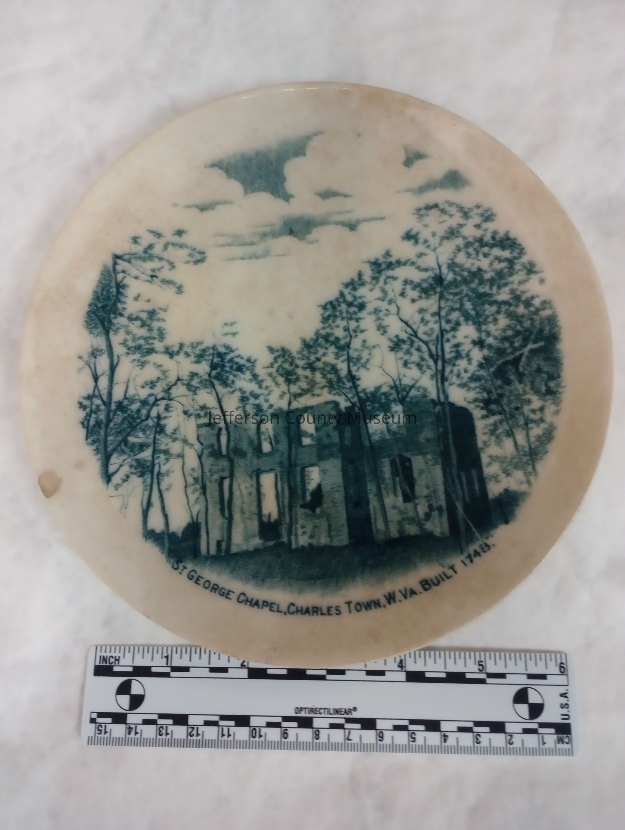 Ceramic plate with blue transfer image of St. George's Chapel in Charles Town. Caption below image reads "St George Chapel, Charles Town, W.Va. Built 1748"Acquisition