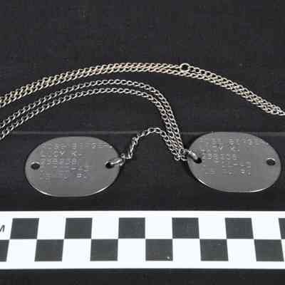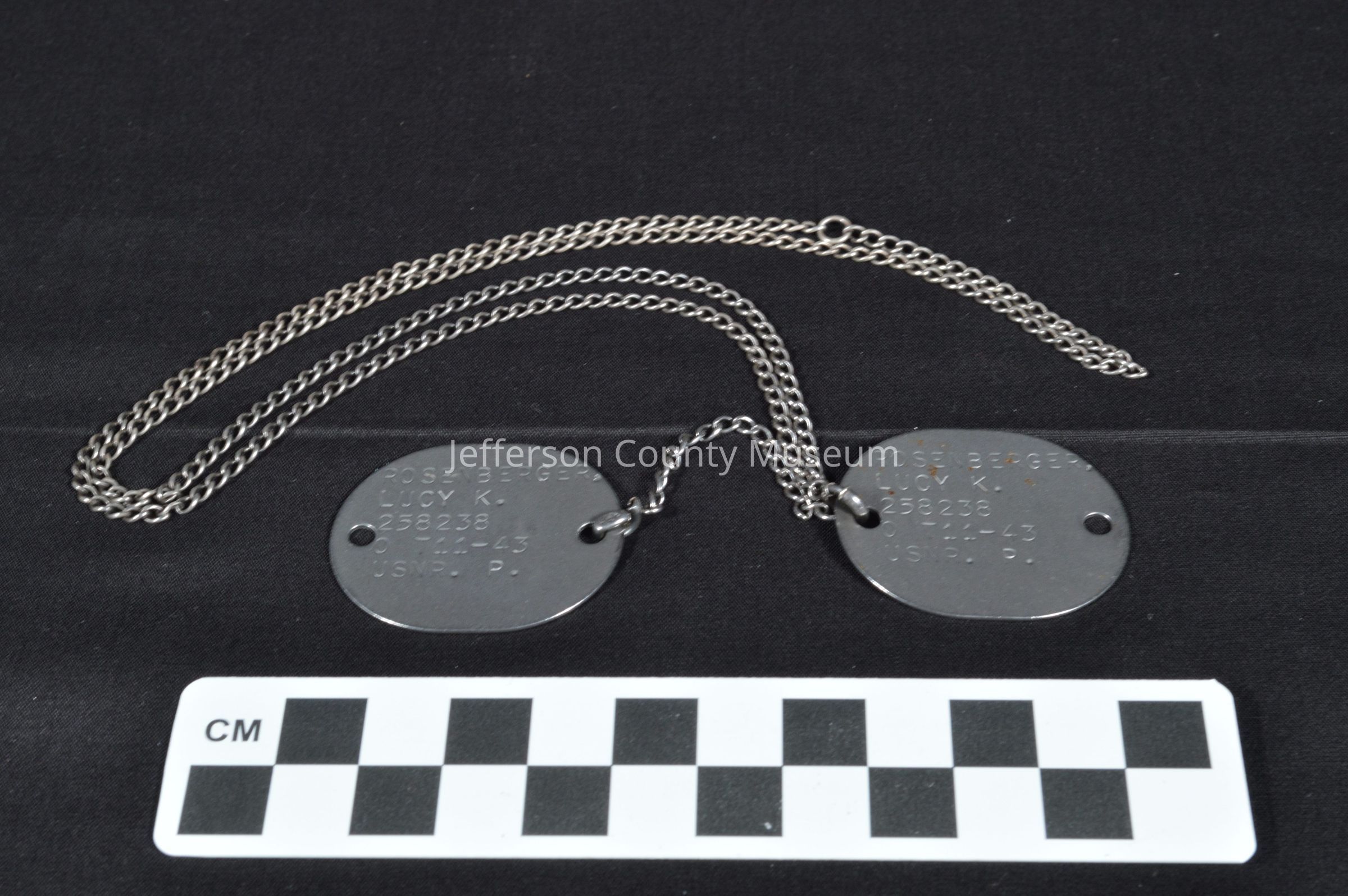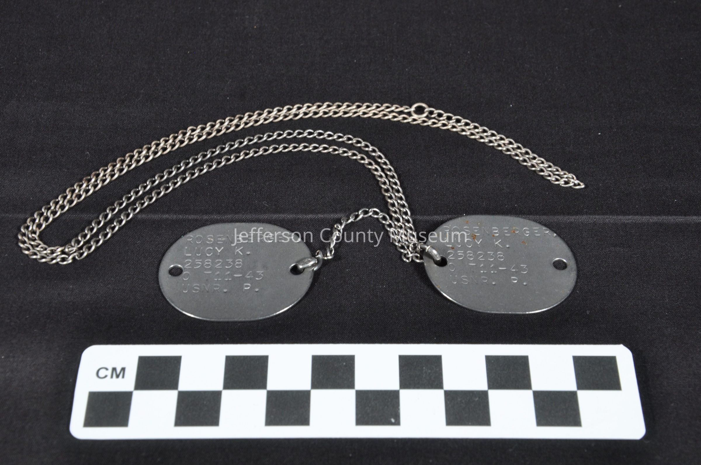 Two oval aluminum tags on metal chain. Embossed in each tag: "ROSENBERGER, LUCY K. 258238 O T11-43 USNR. P."Acquisition
