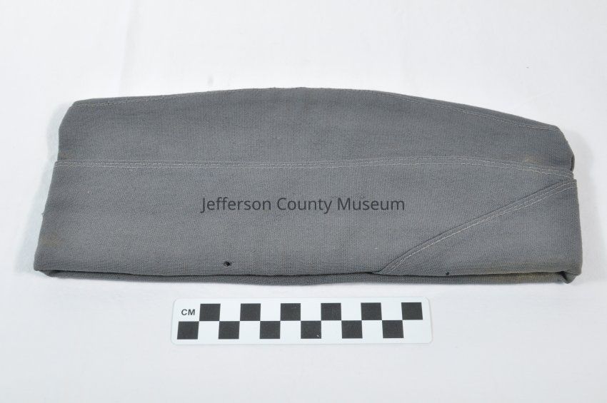 Light gray wool flight cap or military uniform cap with green lining and a brown leather band stitched around interior. Size 6 & 7/8.Acquisition
