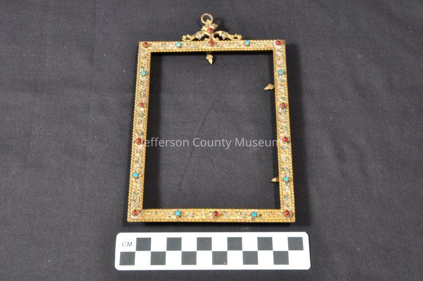 Early 20th century base-metal rectangular picture frame; front of frame is studded with colored glass and engraved with scrolling foliage. At the top is a foliated hanger with ring for hanging.Acquisition
