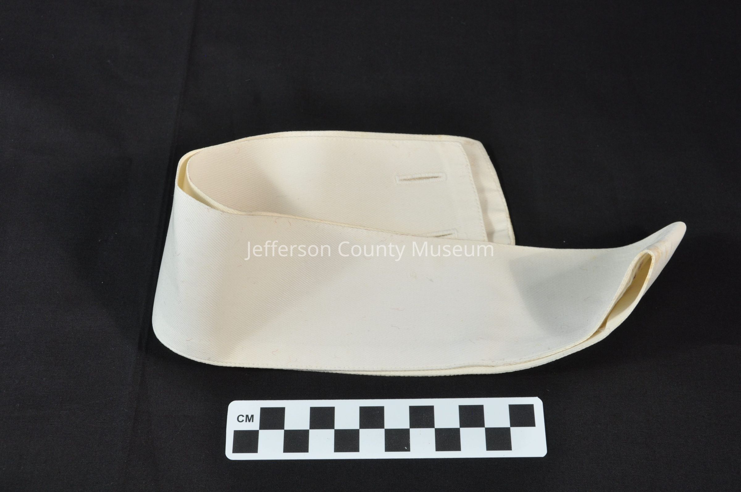White cotton fabric uniform belt, probably part of a nurse's uniform. Two machine-stitched buttonholes at one end; two small round machine-stitched buttonholes at other end. Probably accompanied Object No. 322.Acquisition