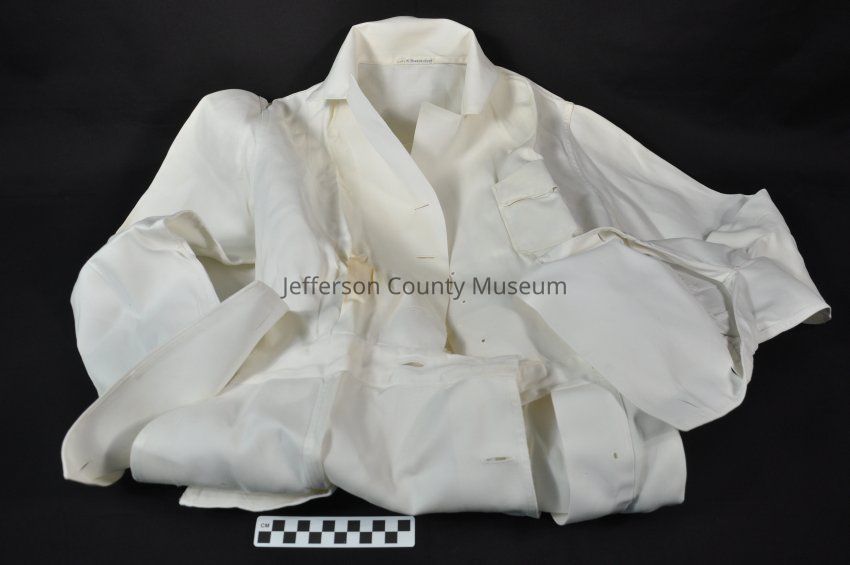 Pearlized shank buttons are in poly bag located in the pocket of the uniform; can be attached if uniform is displayed. Appears to be the same uniform she is wearing in IMG3282.Acquisition