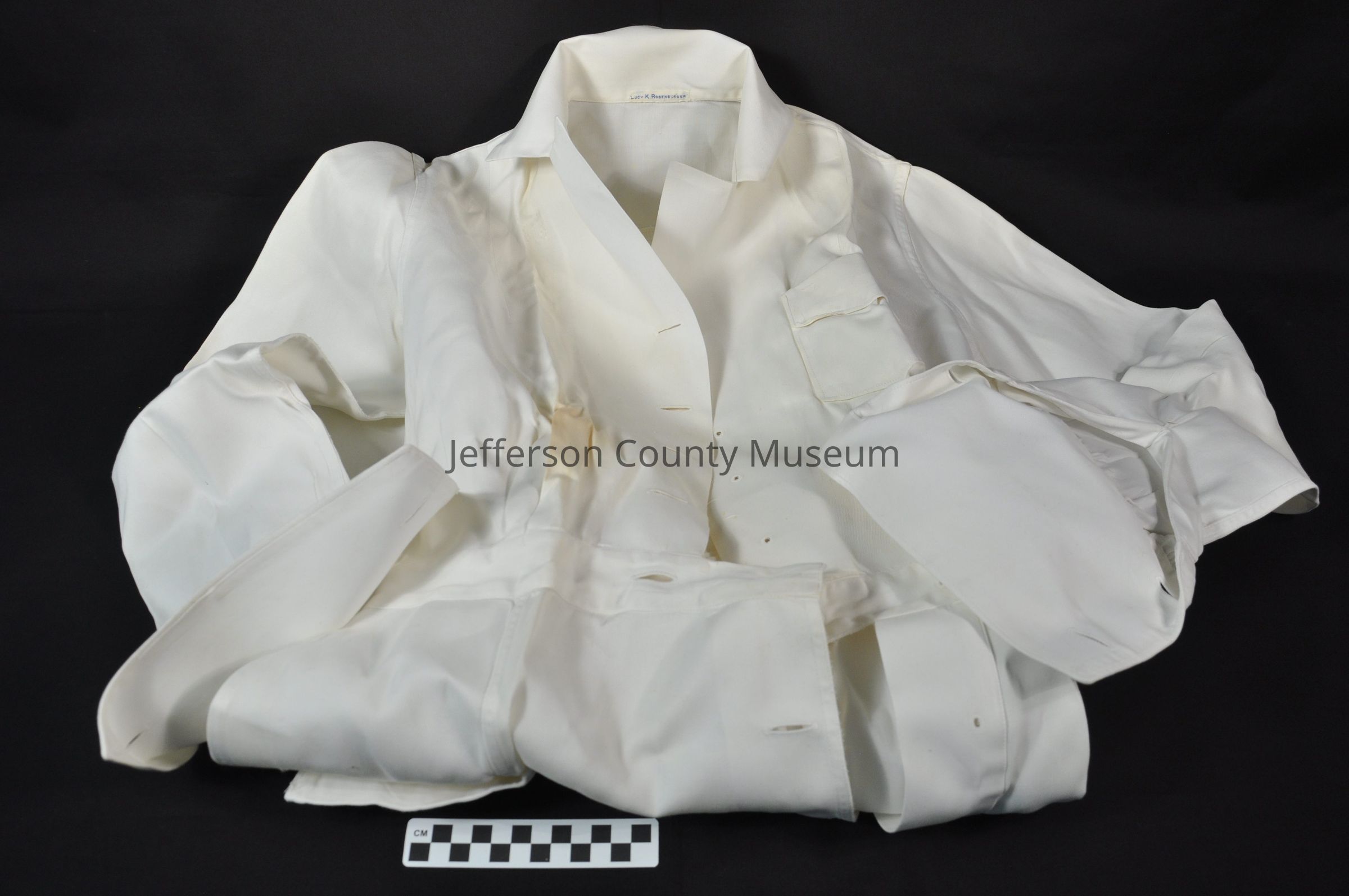 White cotton fabric nurse's uniform. Long sleeves; collar and yoke, left breast pocket, right hip pocket. Name tag hand-stitched on inside of collar, printed in blue: "Lucy K. Rosenberger".